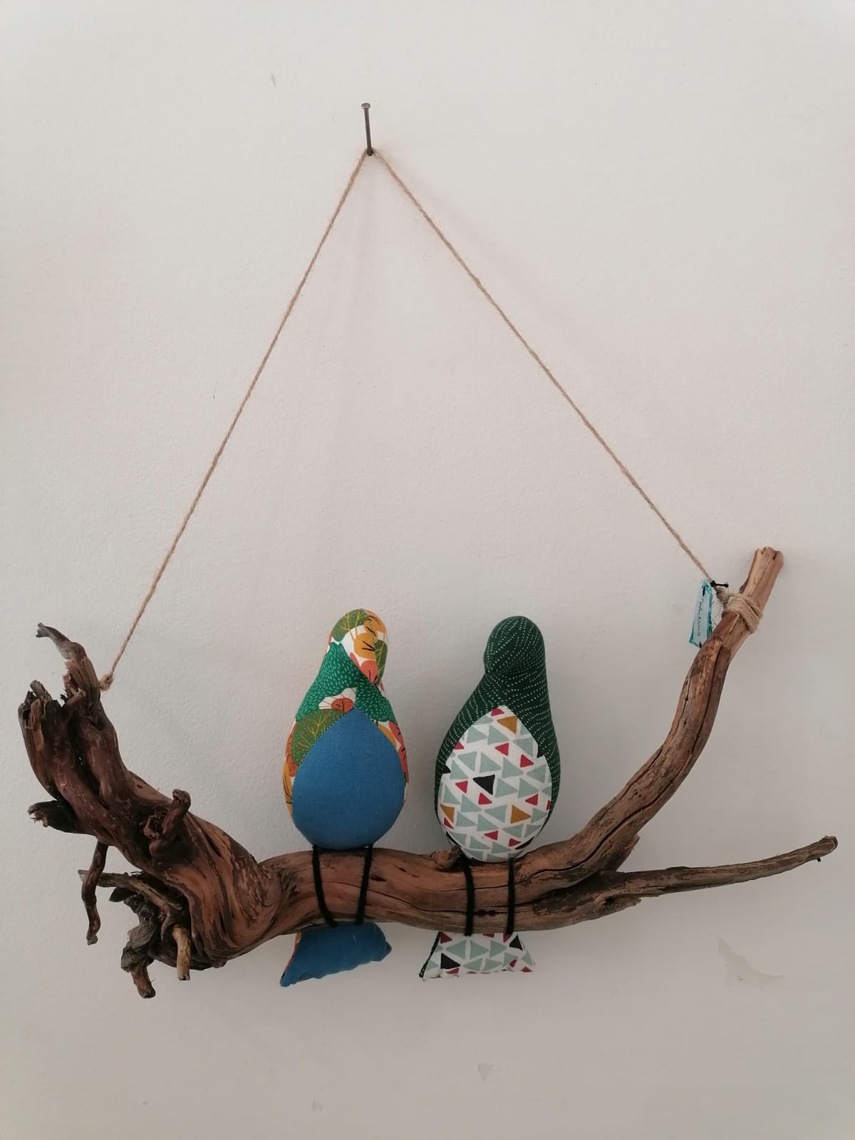 Galho de raíz de esteva com passarinhos de tecido, para pendurar numa parede ou de forma suspensa.