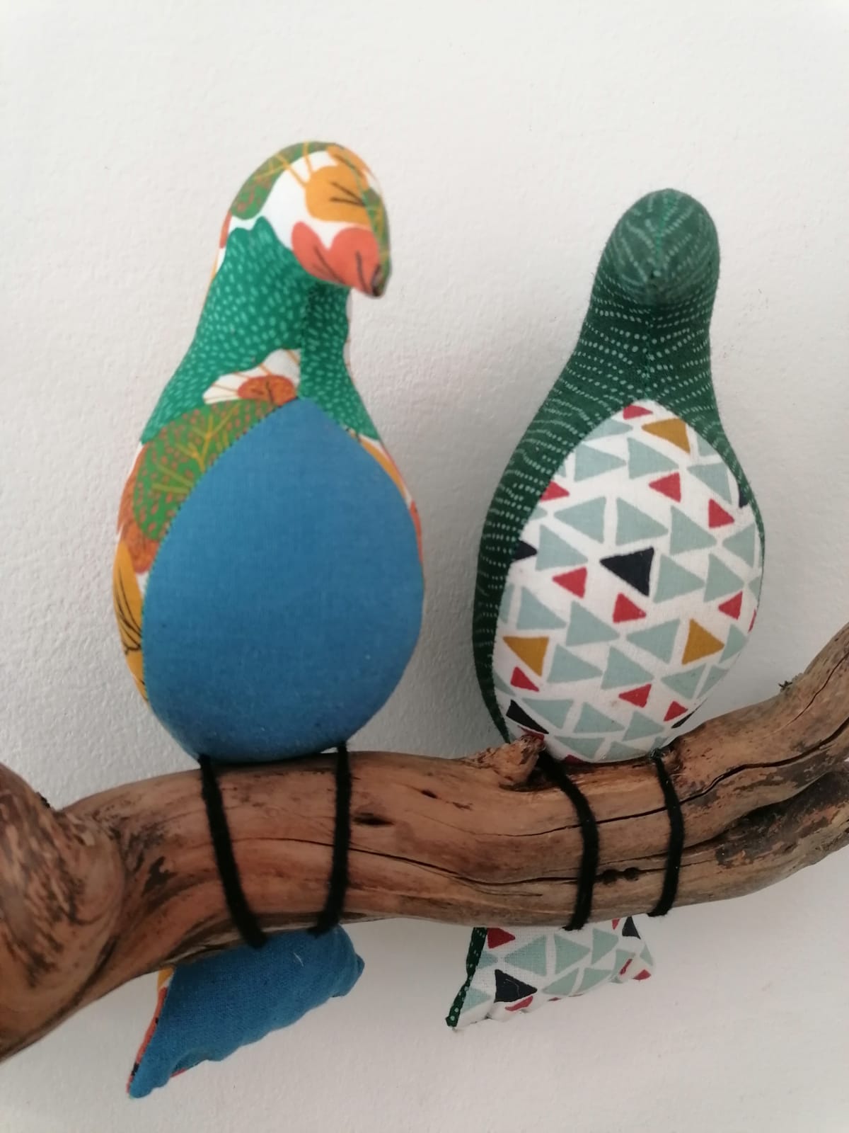 • Decoração de parede com dois pássaros coloridos em tecido sentados em ramo de madeira pendurado
