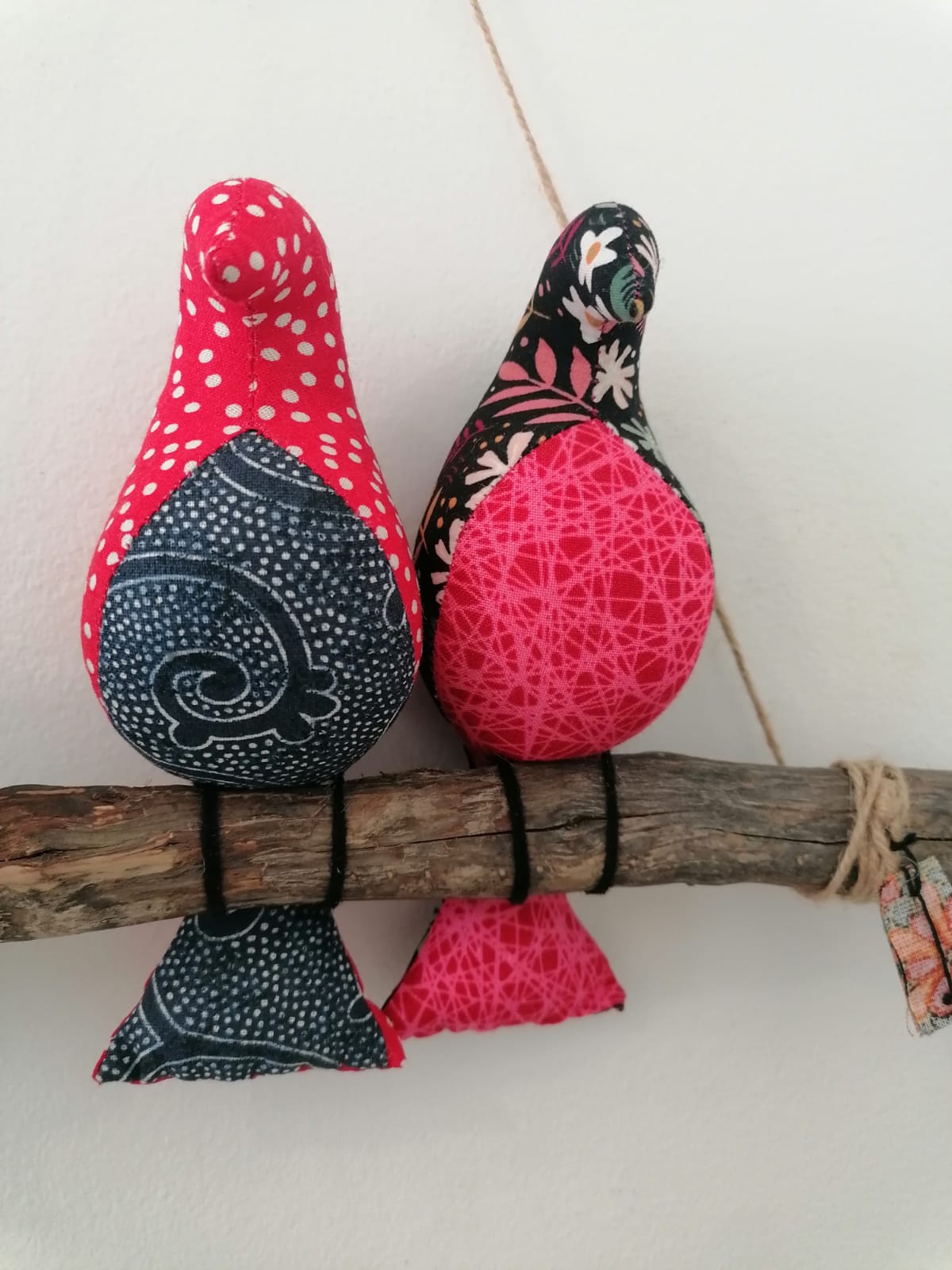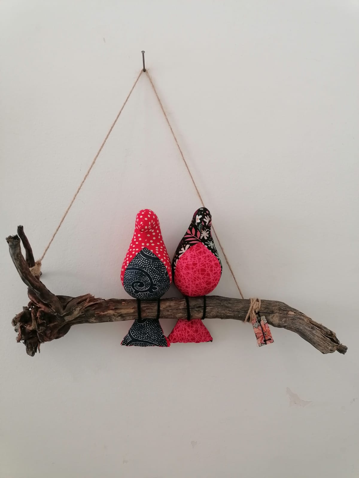 • Decoração artesanal de dois pássaros de tecido sentados num ramo de madeira rústica pendurados na parede