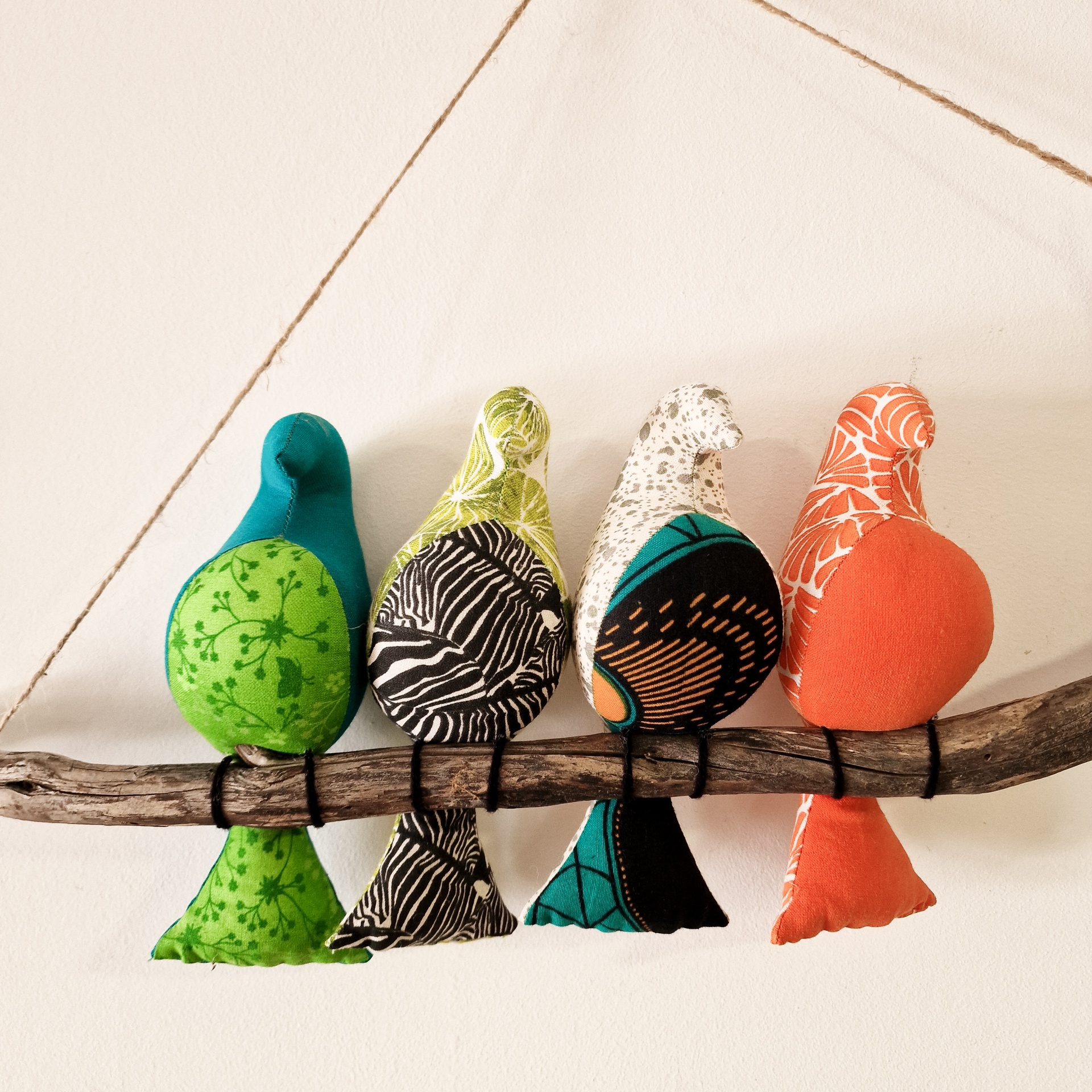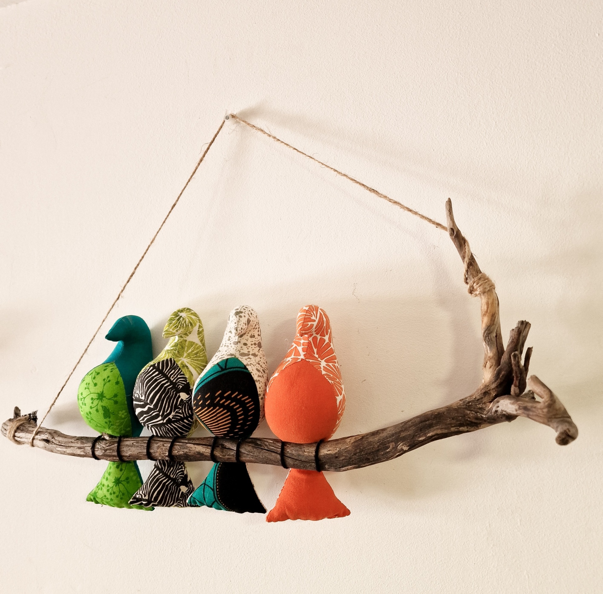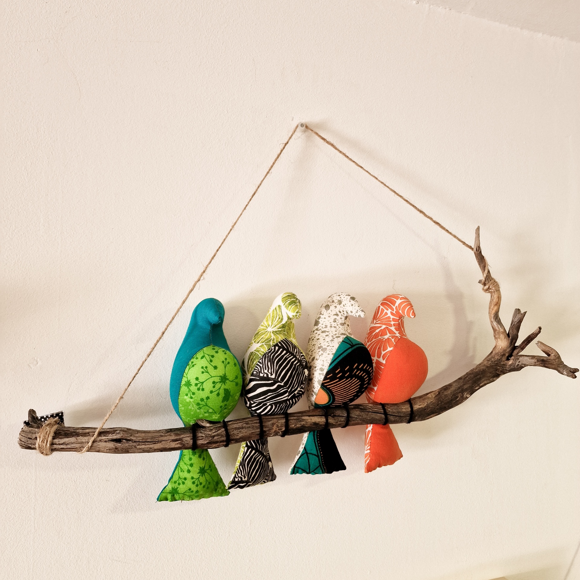 • Decoração de parede com quatro pássaros de tecido colorido em ramo de madeira suspenso por corda