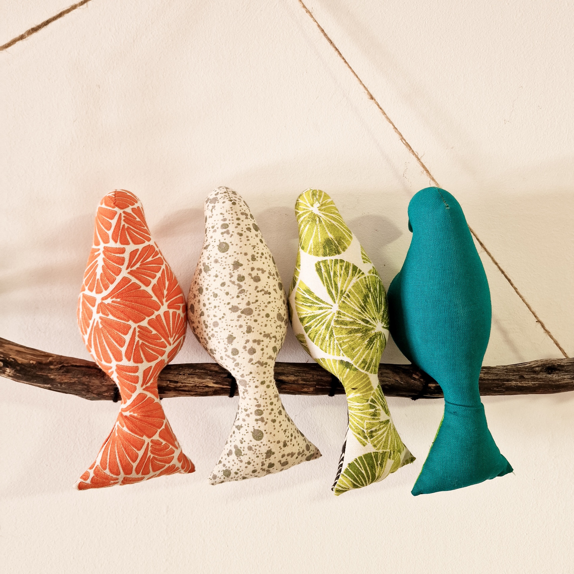 • Peixes decorativos em tecido pendurados num galho com padrões e cores variados.