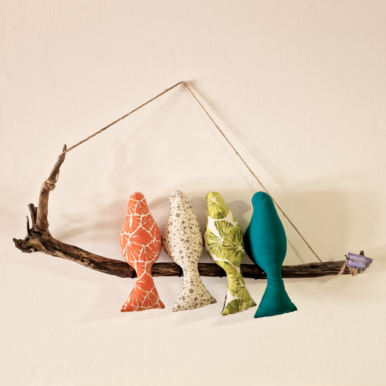 • Decoração pendente de parede com rama de madeira e quatro peixes de tecido coloridos