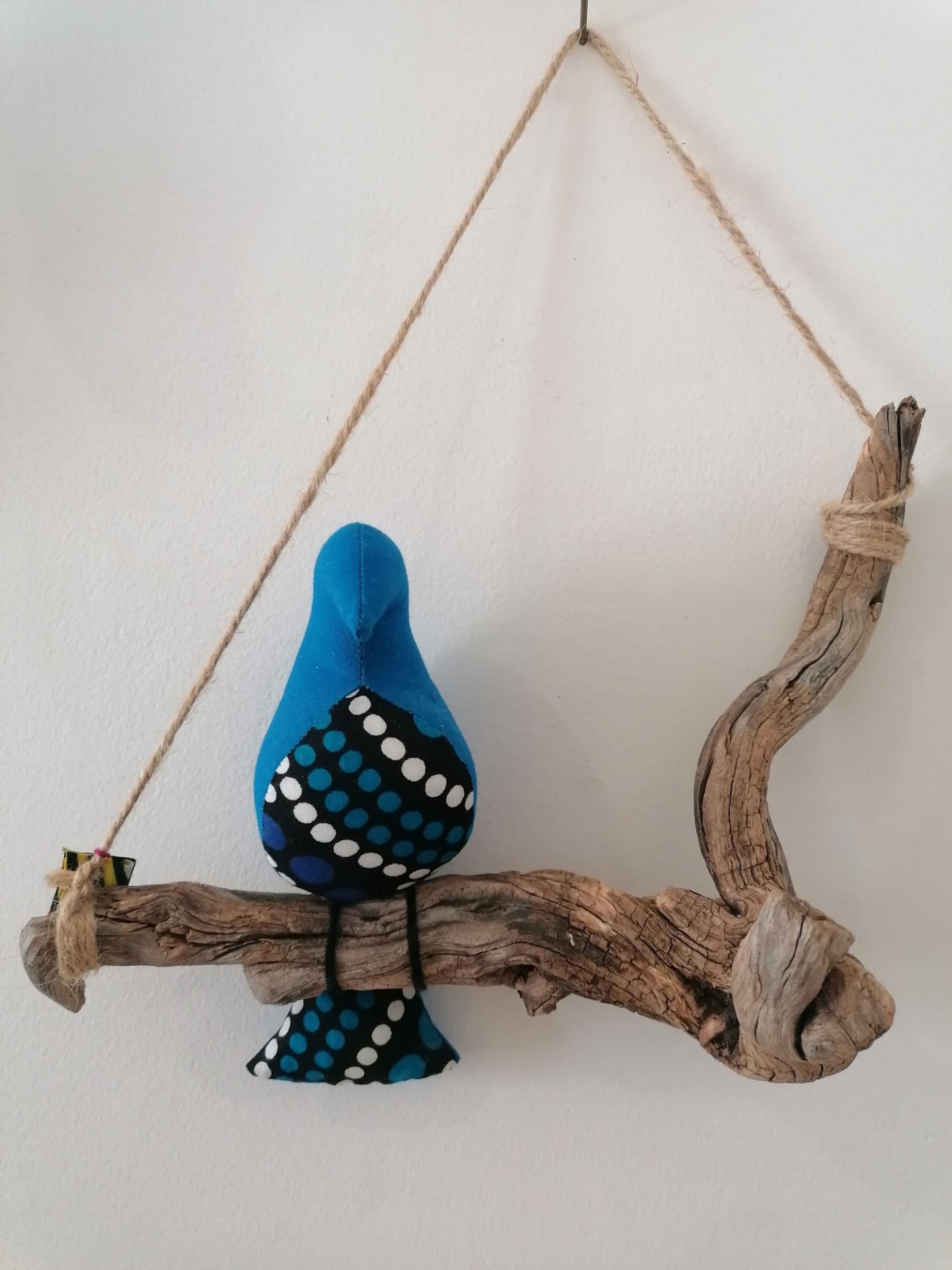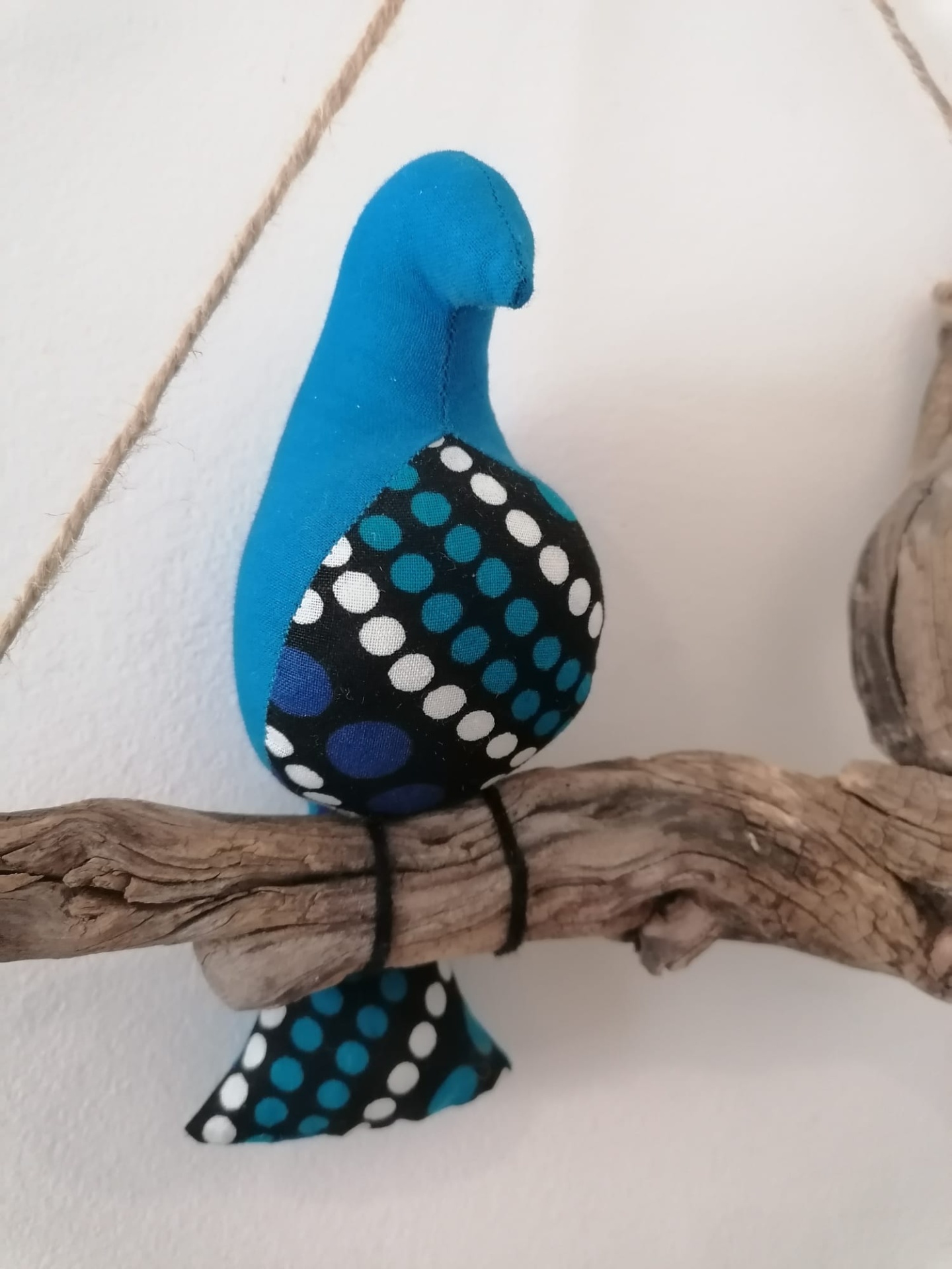 • Pássaro decorativo de tecido azul e preto com bolinhas sentado num galho de madeira