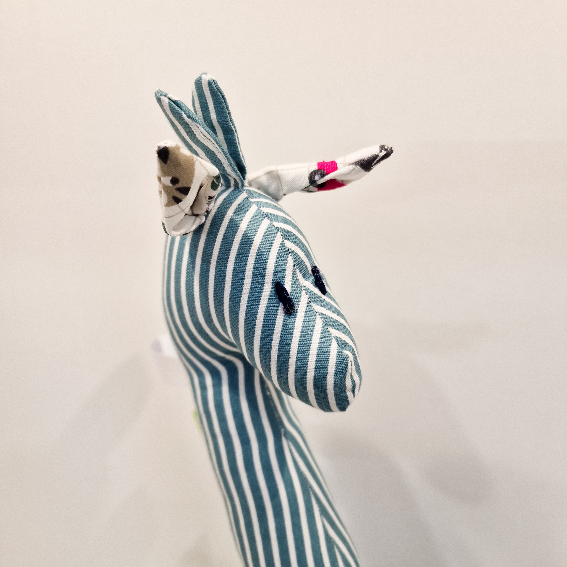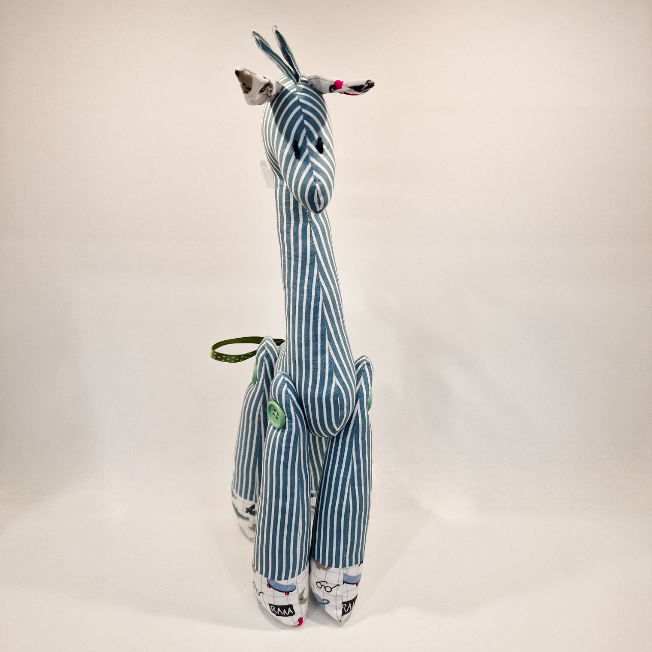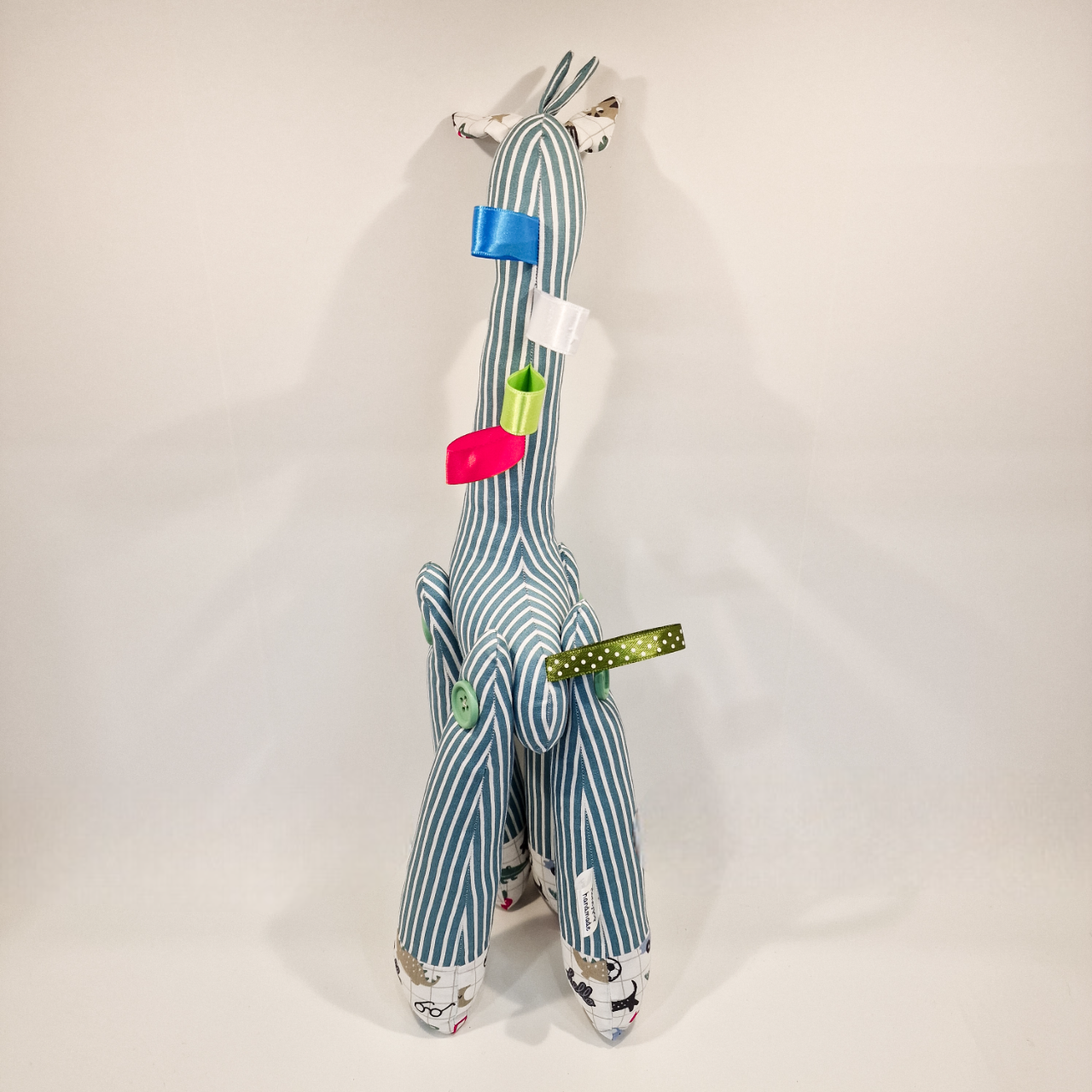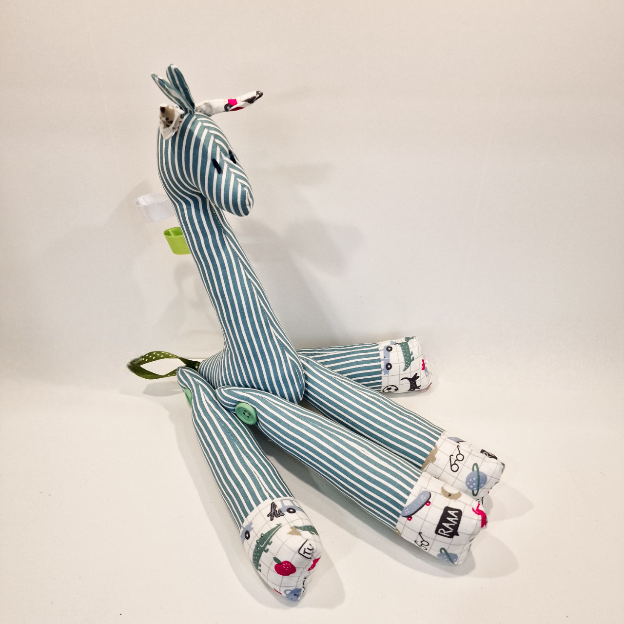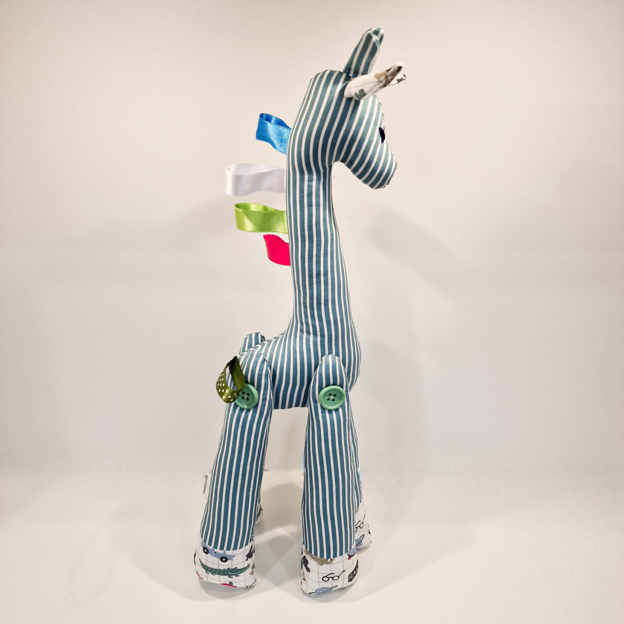 • Boneco de tecido em forma de girafa às riscas brancas e azul-acinzentado