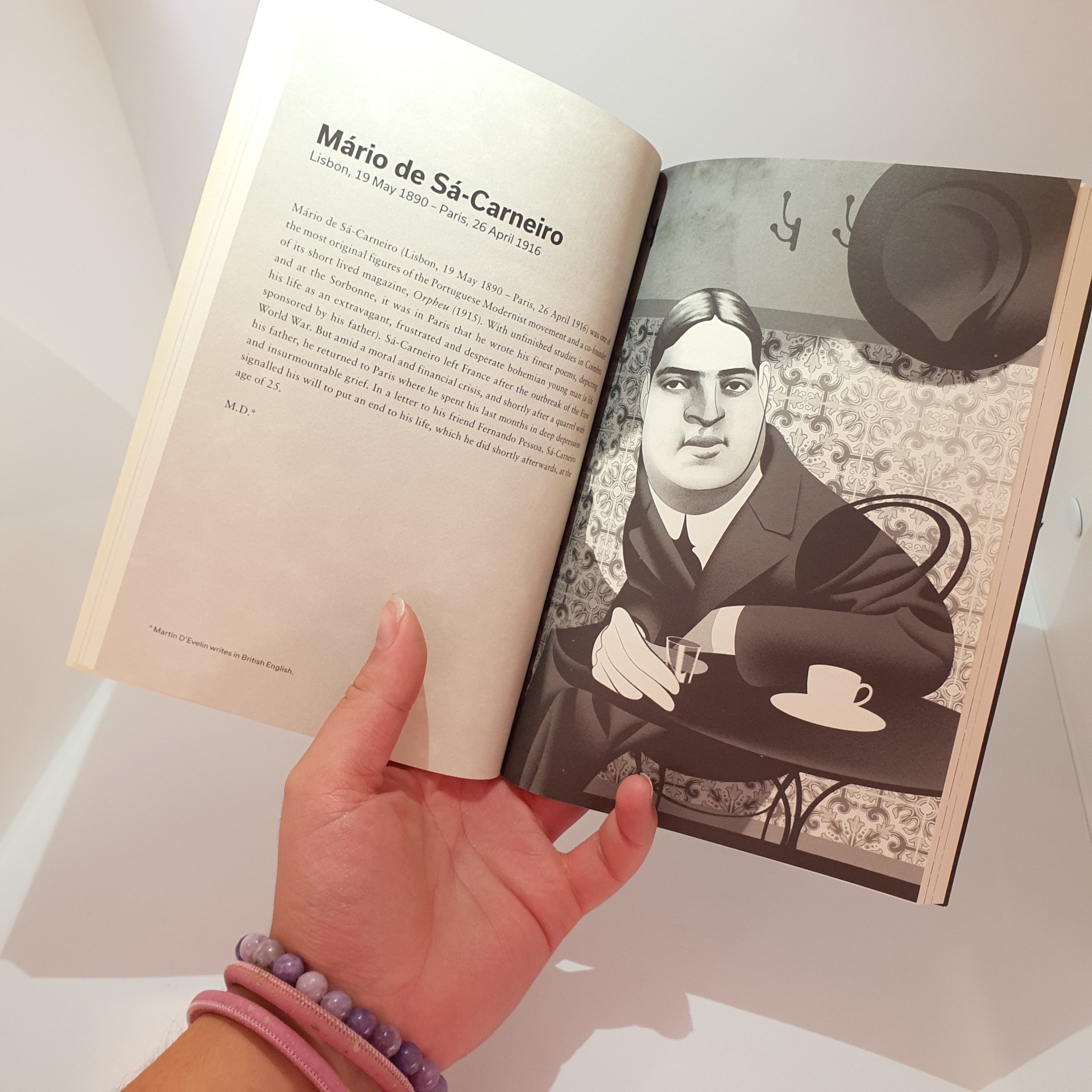 • Livro aberto com texto sobre Mário de Sá-Carneiro e ilustração em preto e branco dele sentado numa mesa com chávena de café