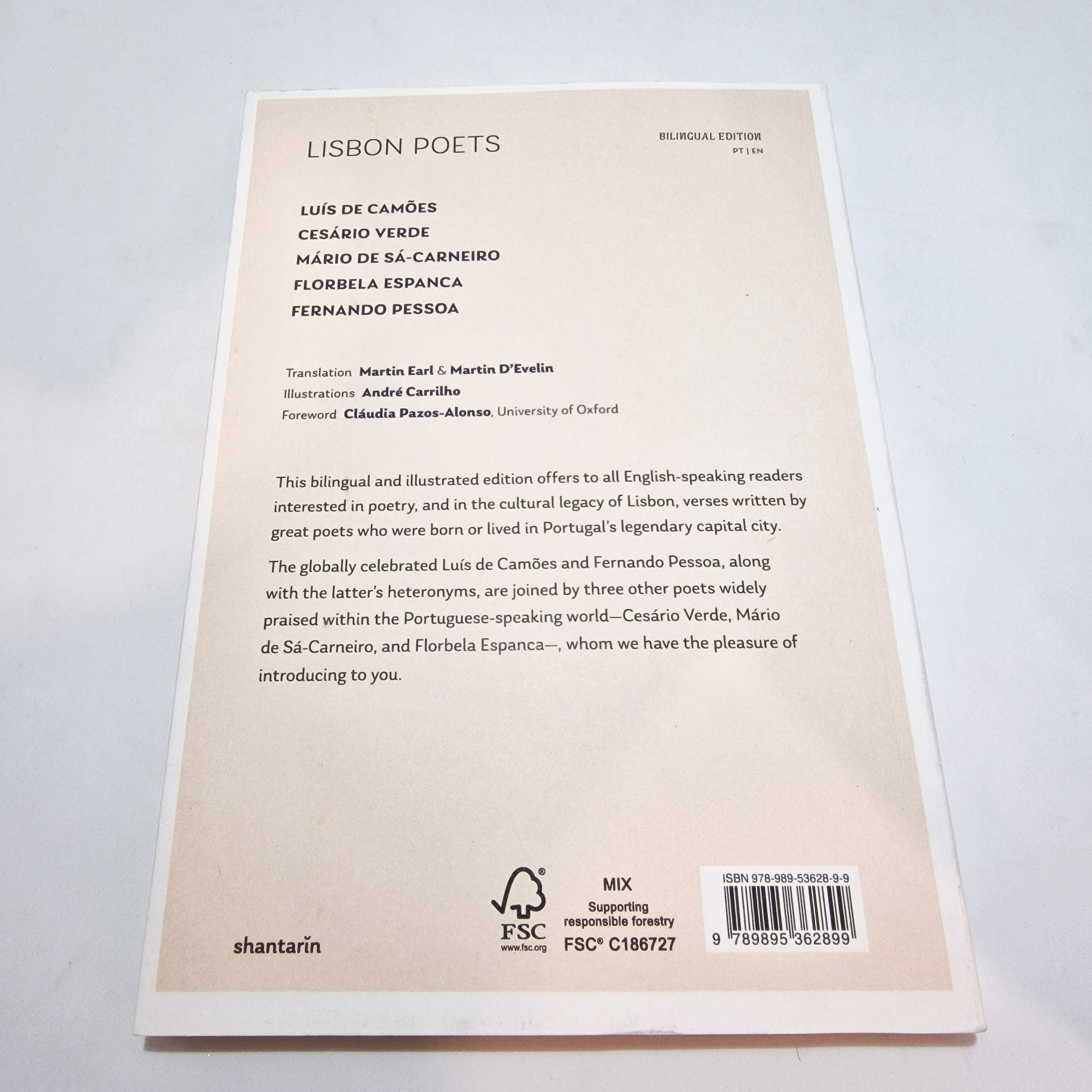 • Parte de trás do livro LISBON POETS com texto e selo FSC