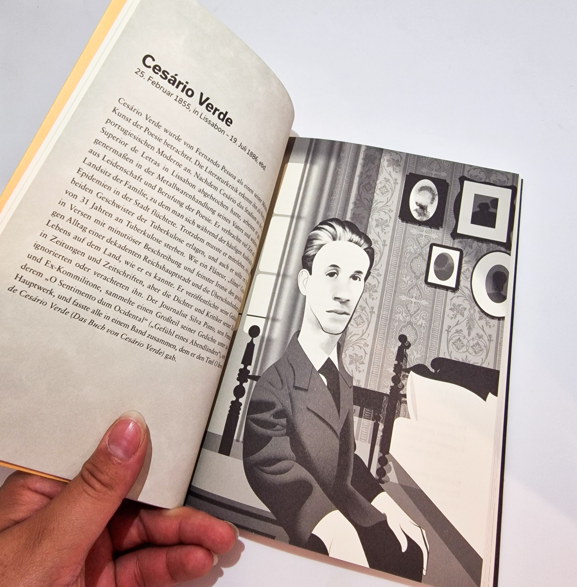 • Livro aberto com texto sobre Cesário Verde e ilustração a preto e branco de homem sentado.