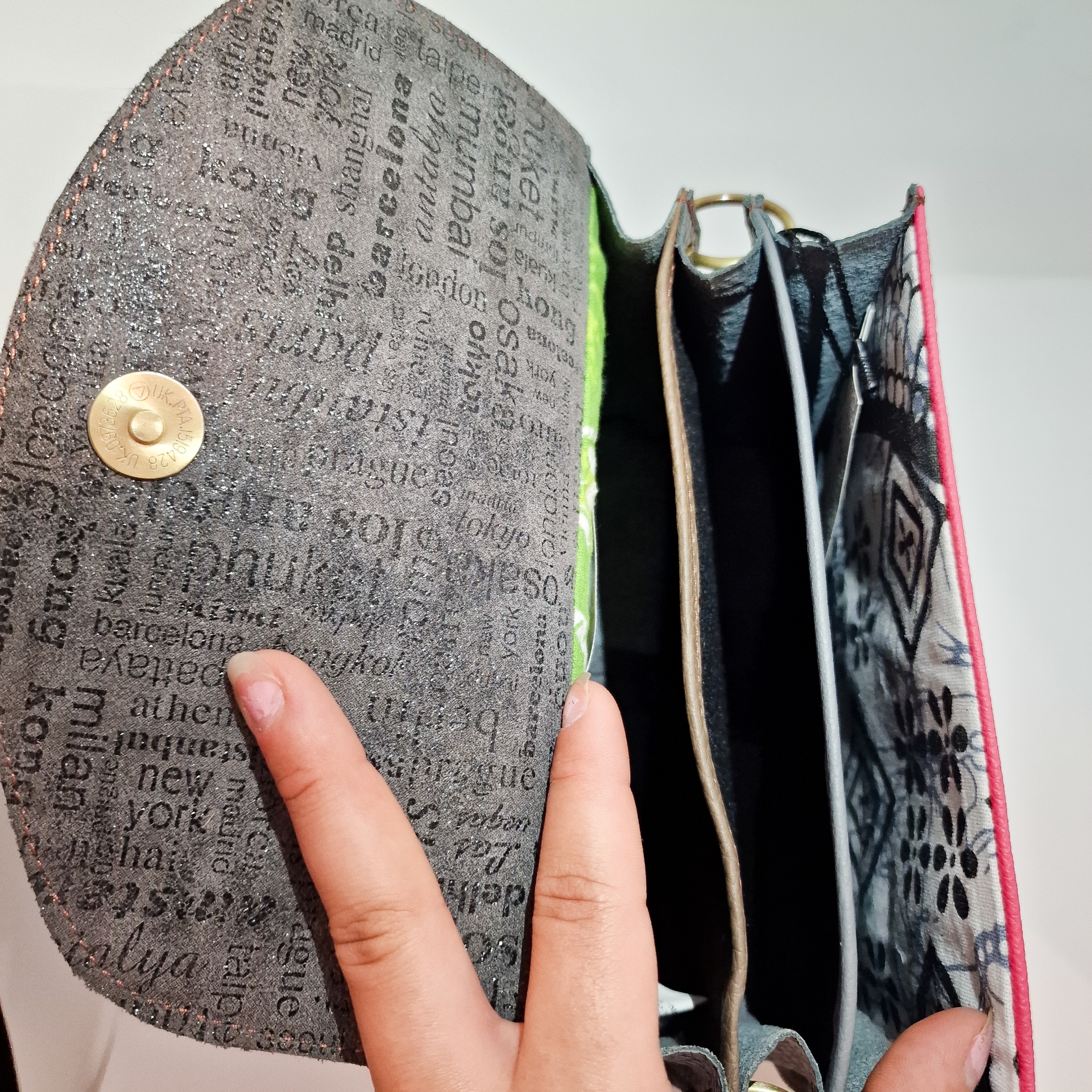 • Carteira com interior colorido aberta e padrão exterior preto e branco
