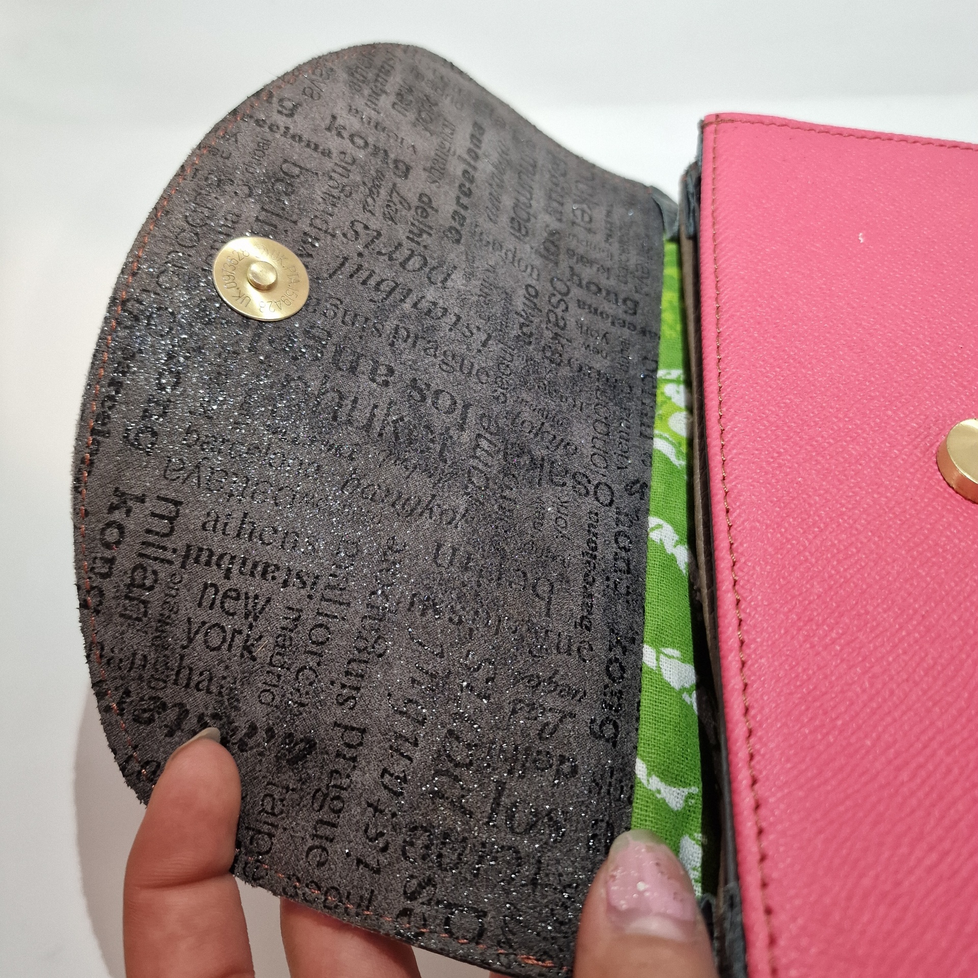• Carteira rosa com interior de texto e fecho magnético dourado