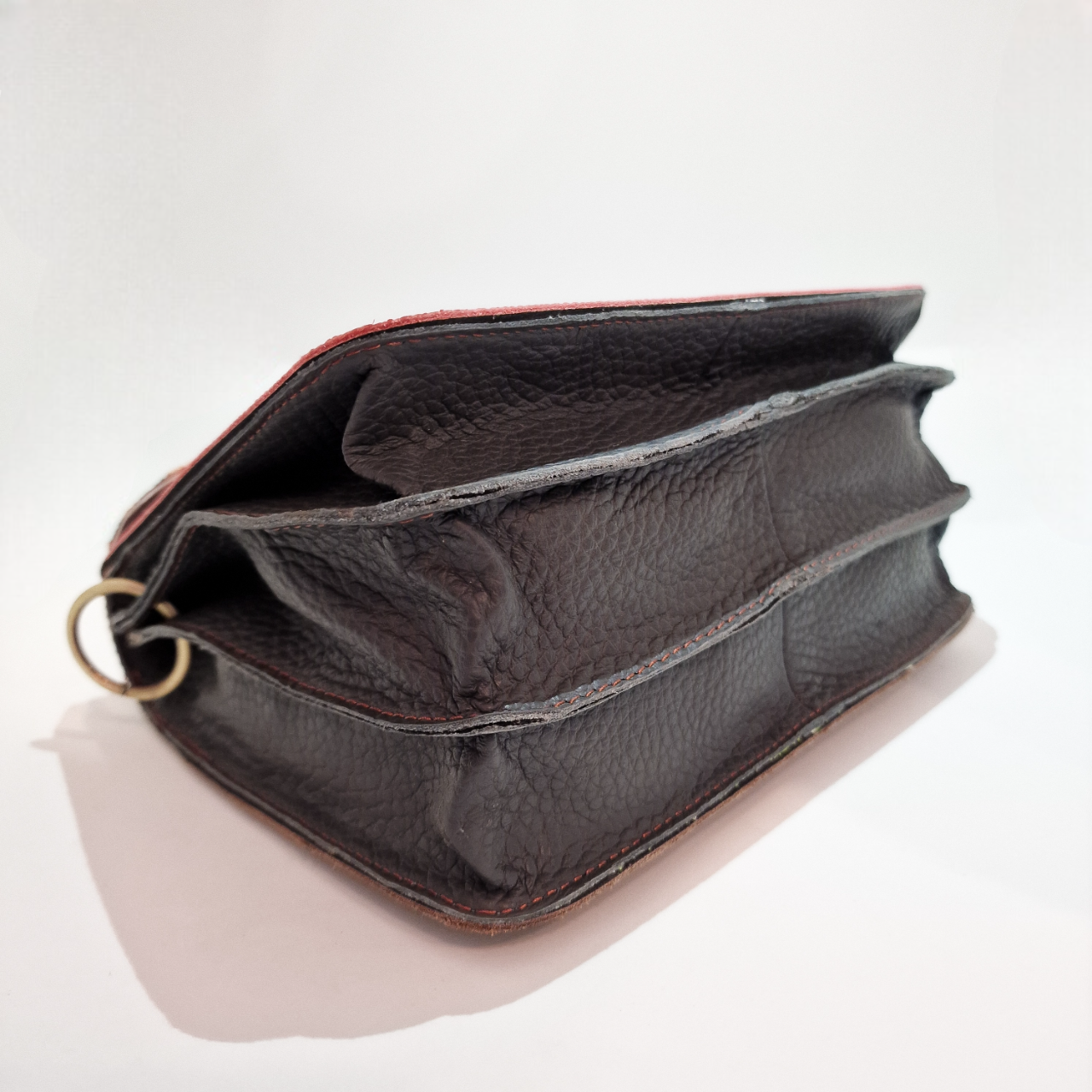 • Bolsa de pele castanho escuro com textura rugosa e divisões visíveis