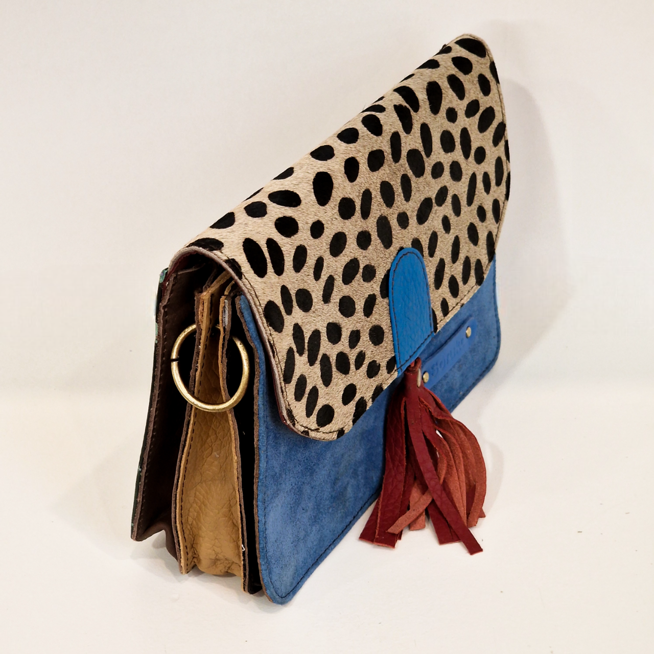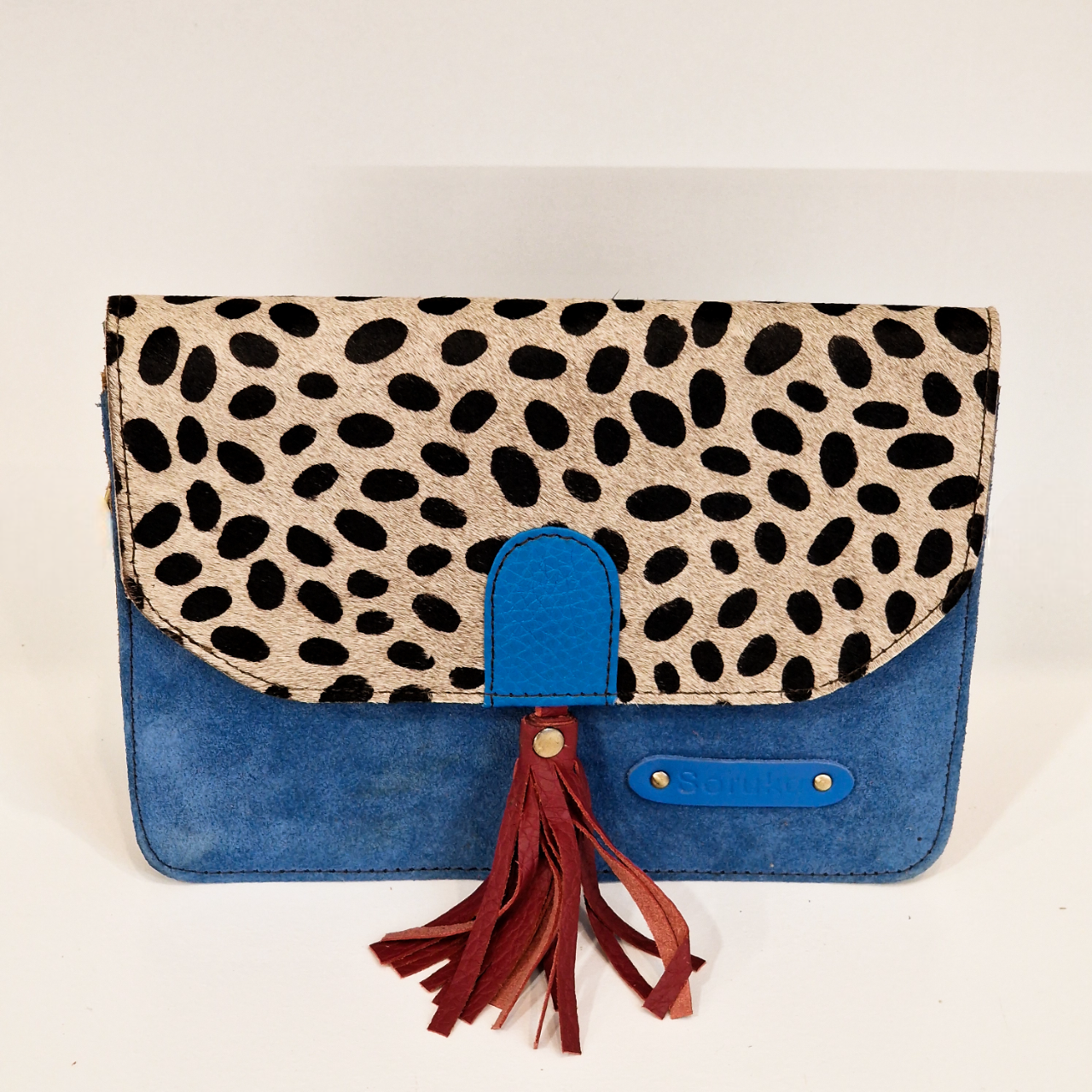 • Carteira azul de camurça com aba de padrão animal preto e branco e franjas castanhas