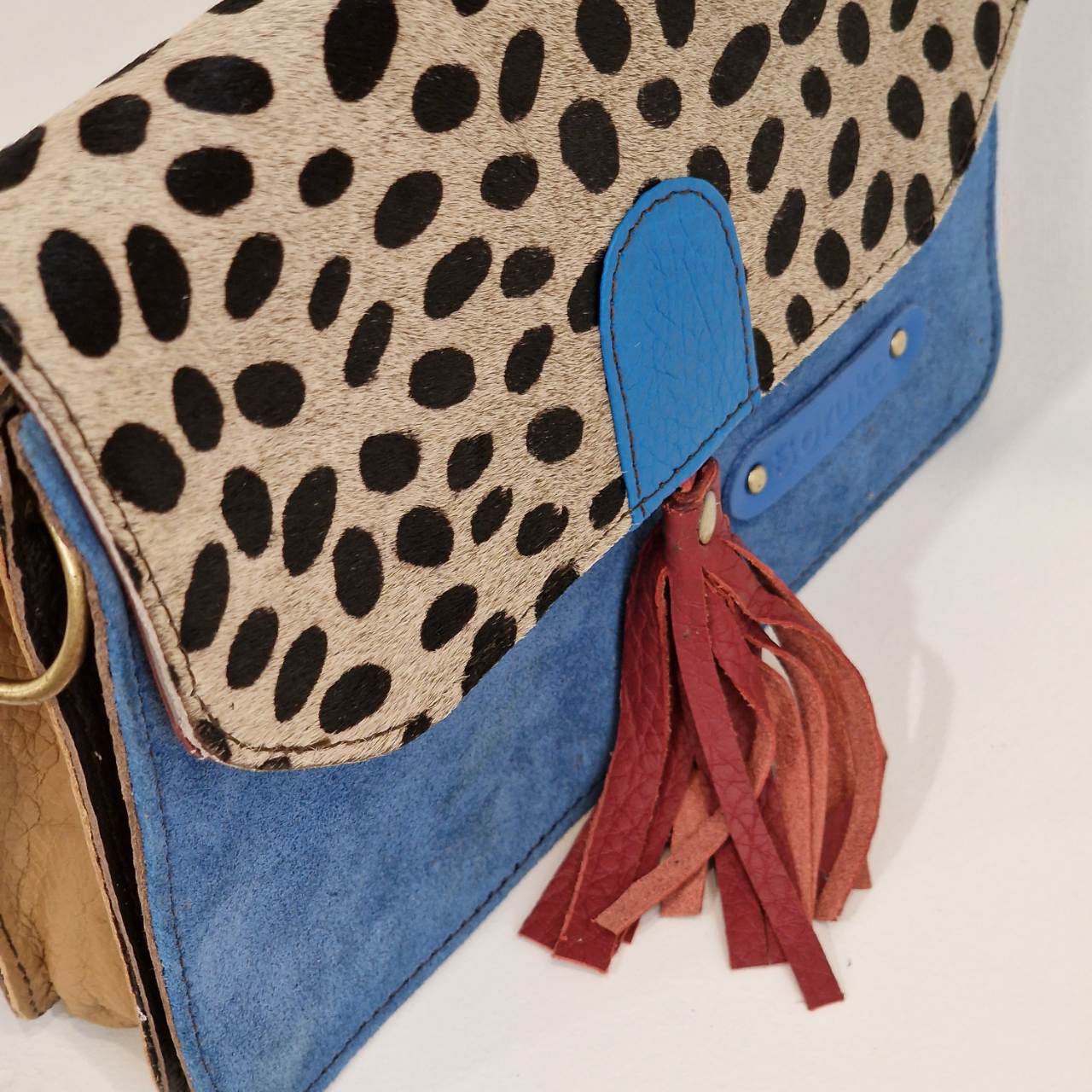 • Mala de couro com padrão animal, detalhes em azul, franjas vermelhas e rosa