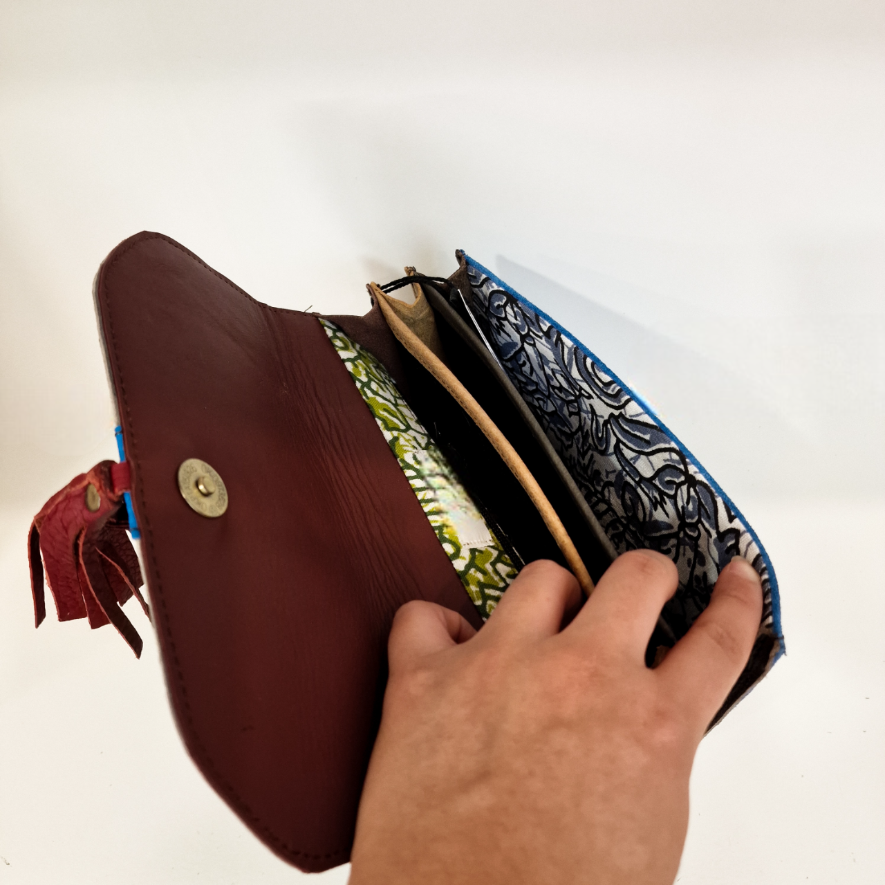 • Carteira castanha em pele com fecho metálico e compartimentos com padrões coloridos