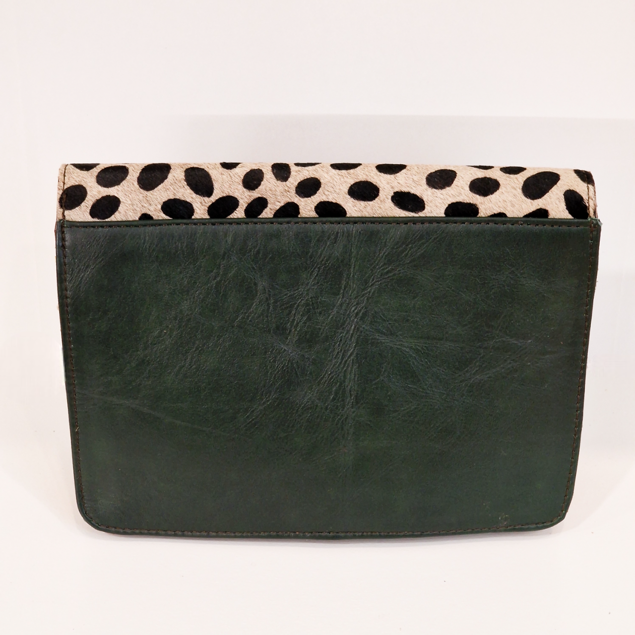 • Mala carteira pele verde escura com aba em padrão animal preto e bege