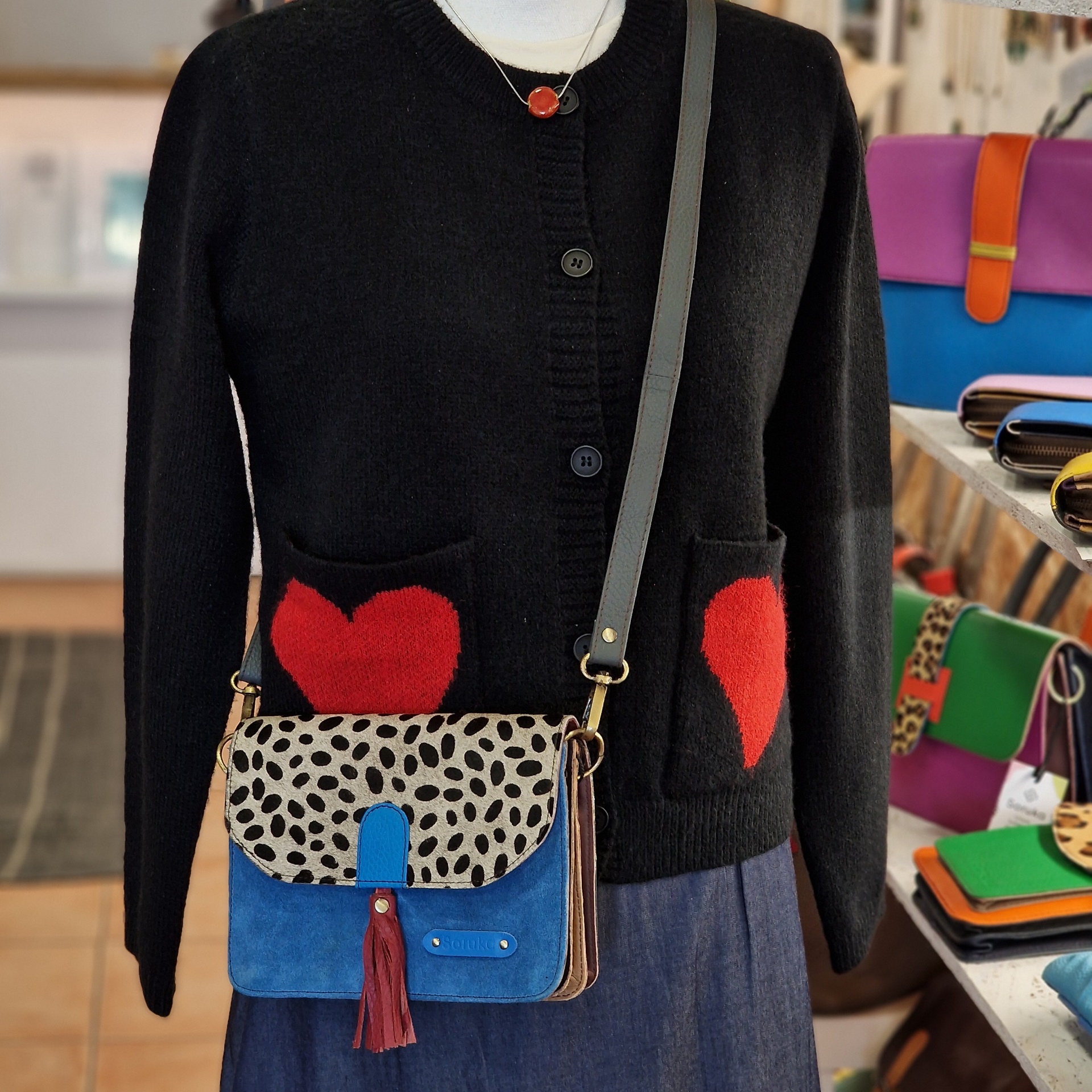 • Cardigã preto com corações vermelhos nos bolsos e bolsa azul com padrão de manchas e tassel
