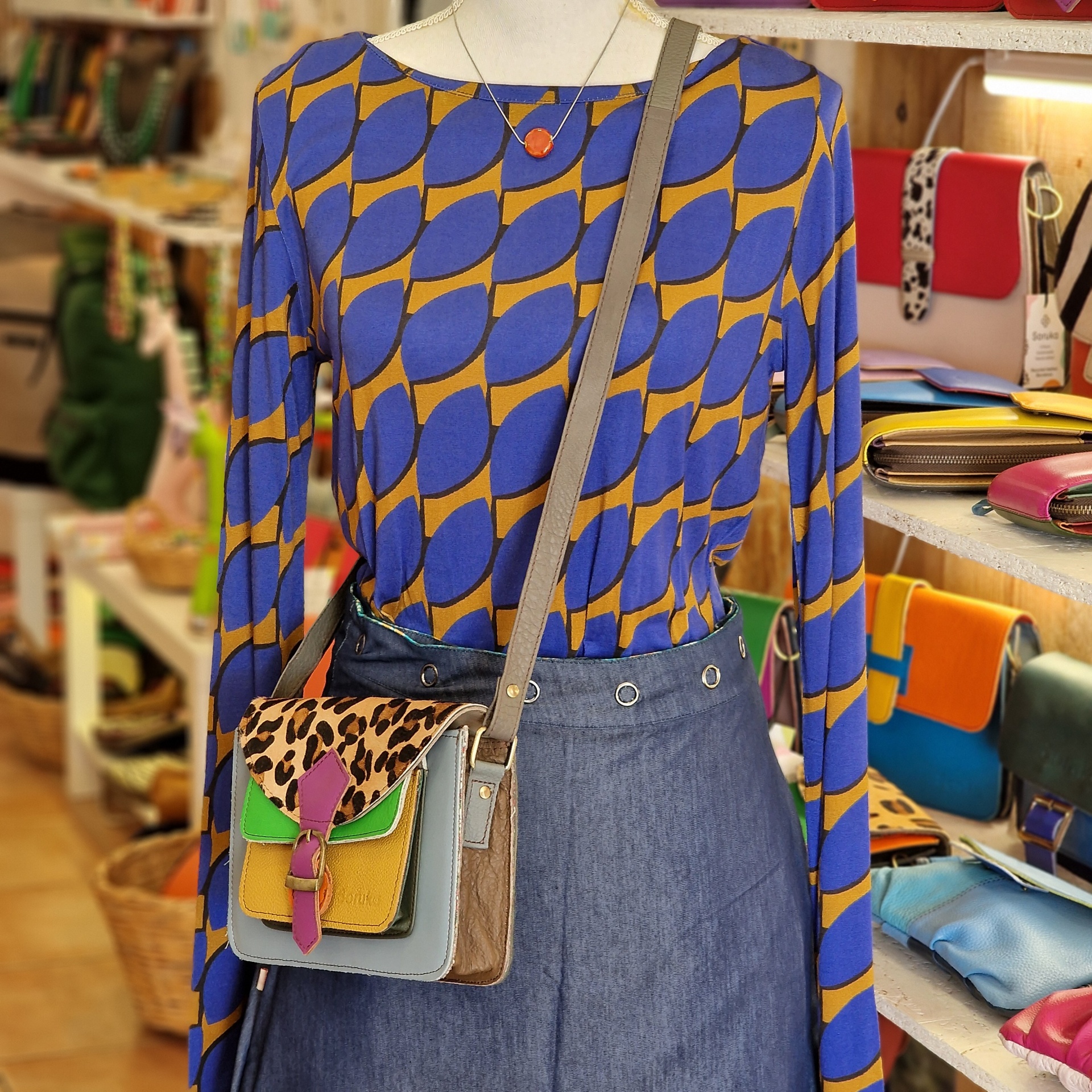 • Mala de ombro pequena multicolor em pele com padrão animal e fecho com fivela