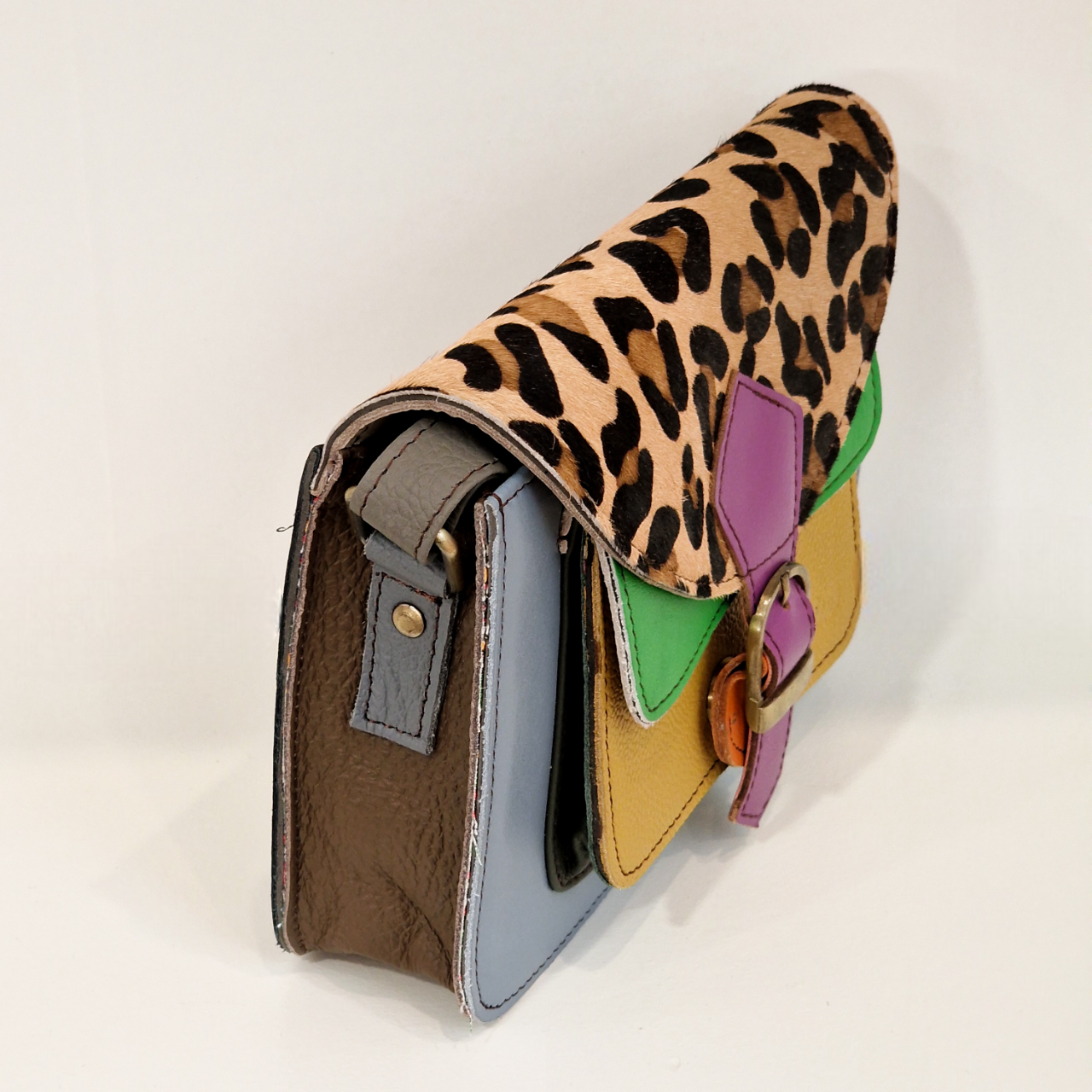 • Mala pequena colorida com padrão animal print e detalhe em fivela