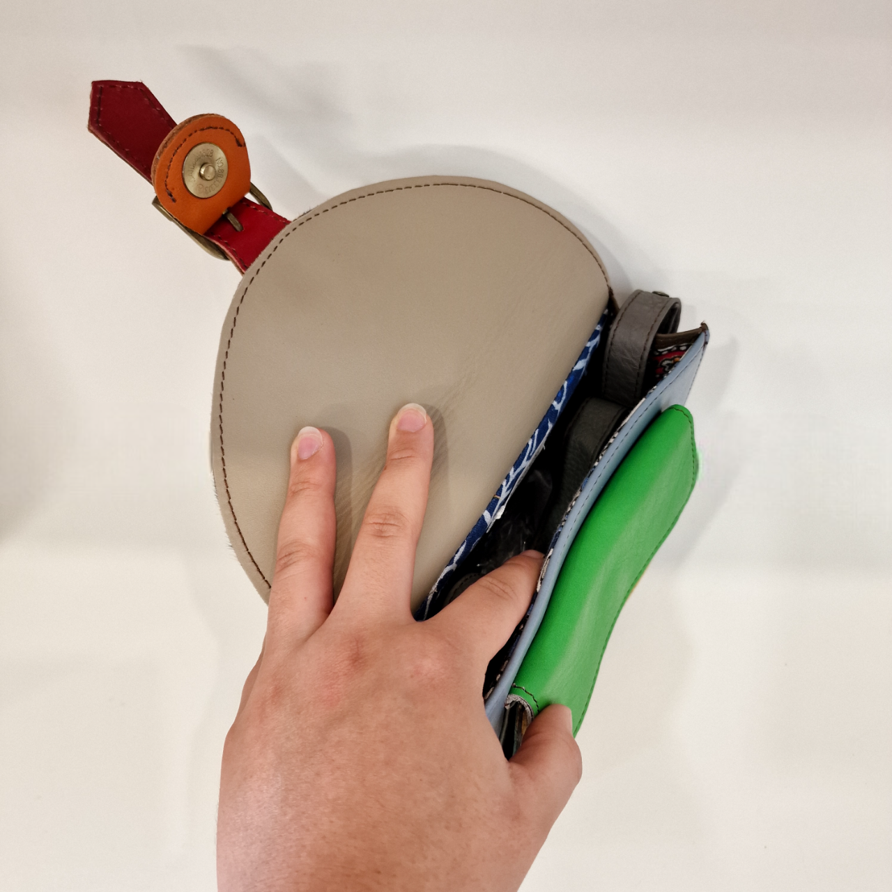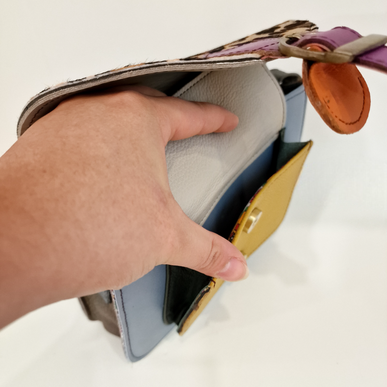 • Bolsa pequena multicolorida sendo aberta por uma mão para mostrar interior cinzento claro.