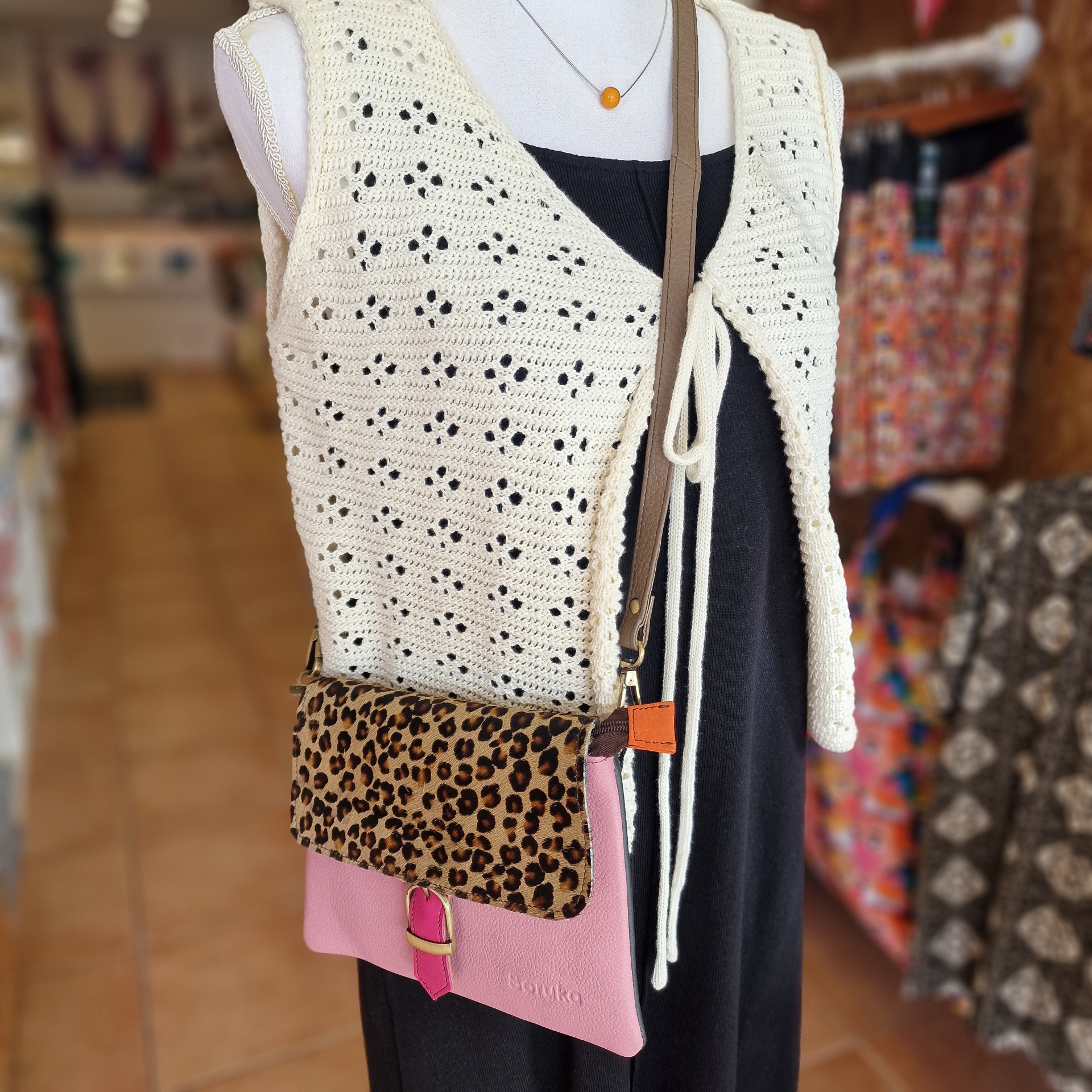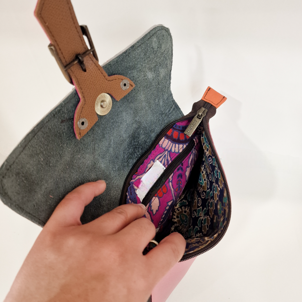 Mala 100% couro reciclado, inclui uma alça de couro ajustável e extensível.