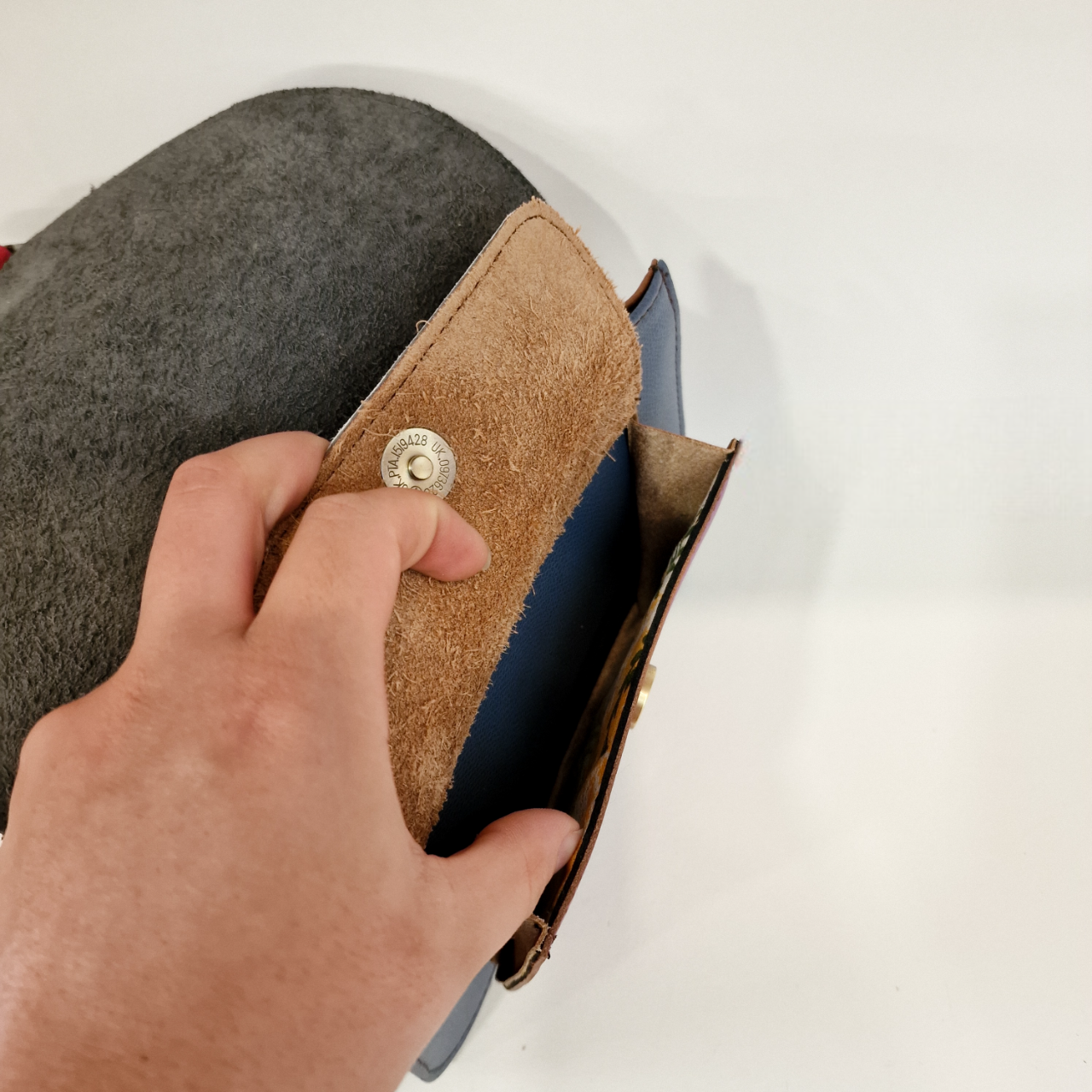 • Carteira pequena azul com botão dourado e interior em camurça castanha