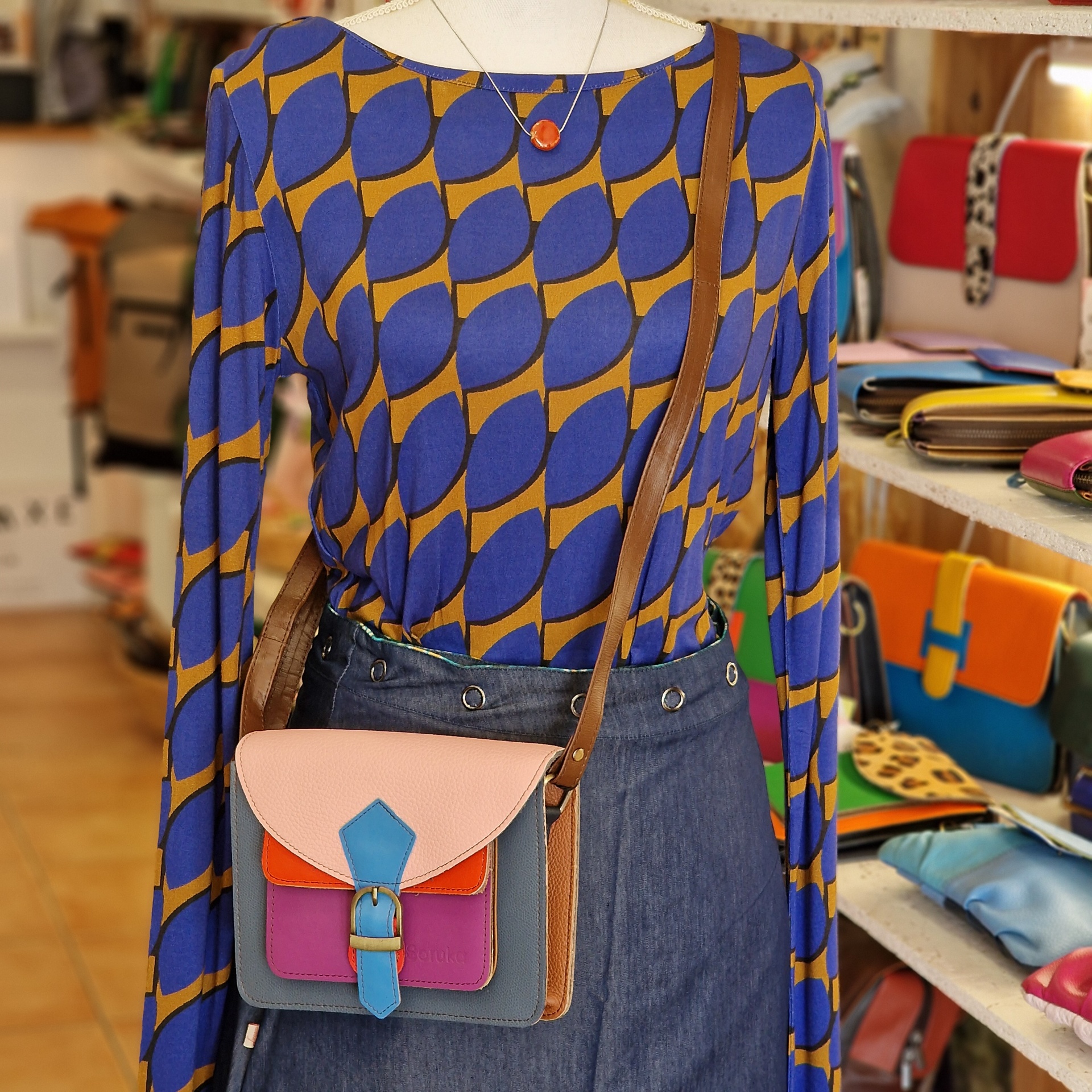 • Mala de ombro em couro colorida, blusa geométrica azul e castanha, saia denim, loja com várias malas ao fundo