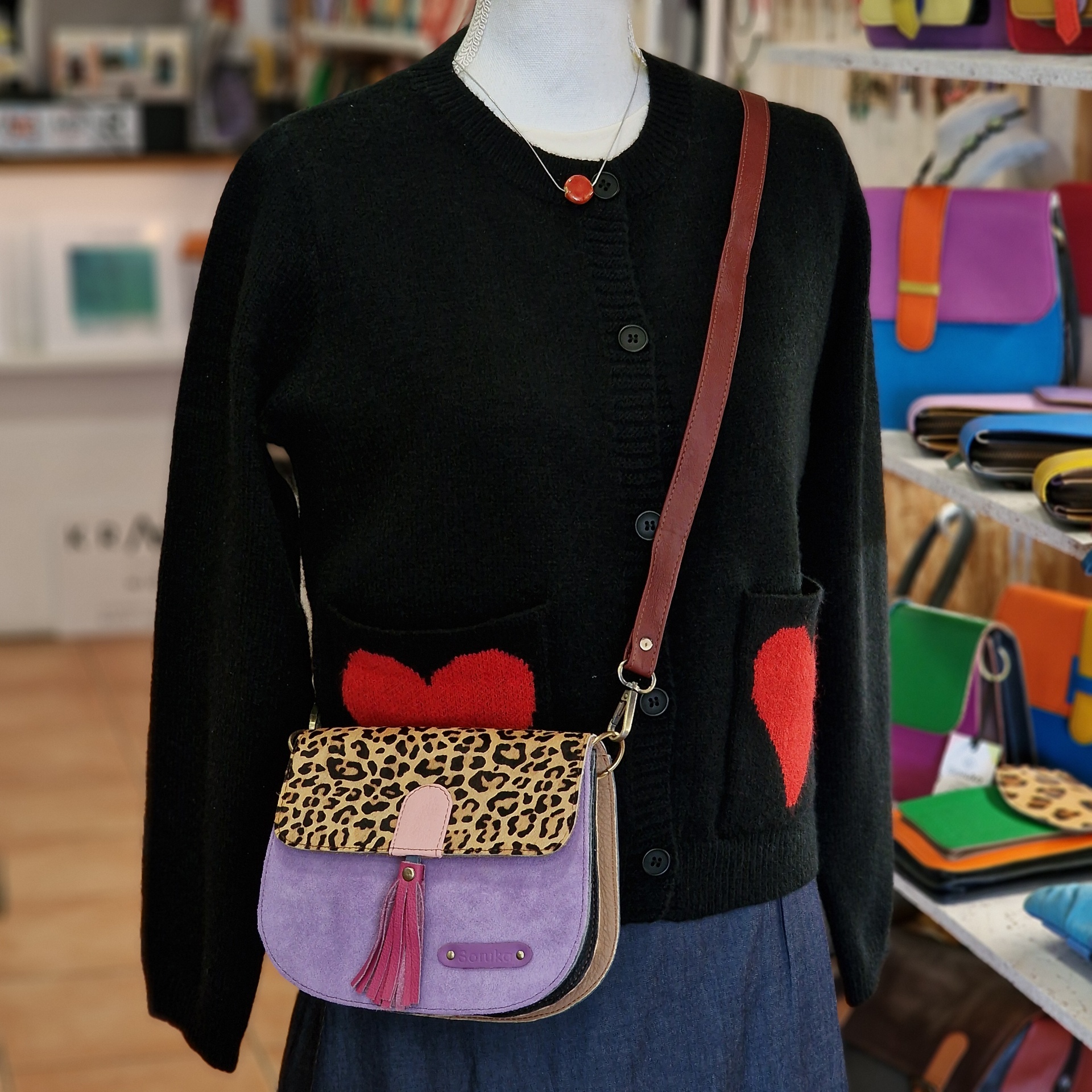 • Carteira tiracolo lilás com padrão animal print e cardigan preto com corações vermelhos.