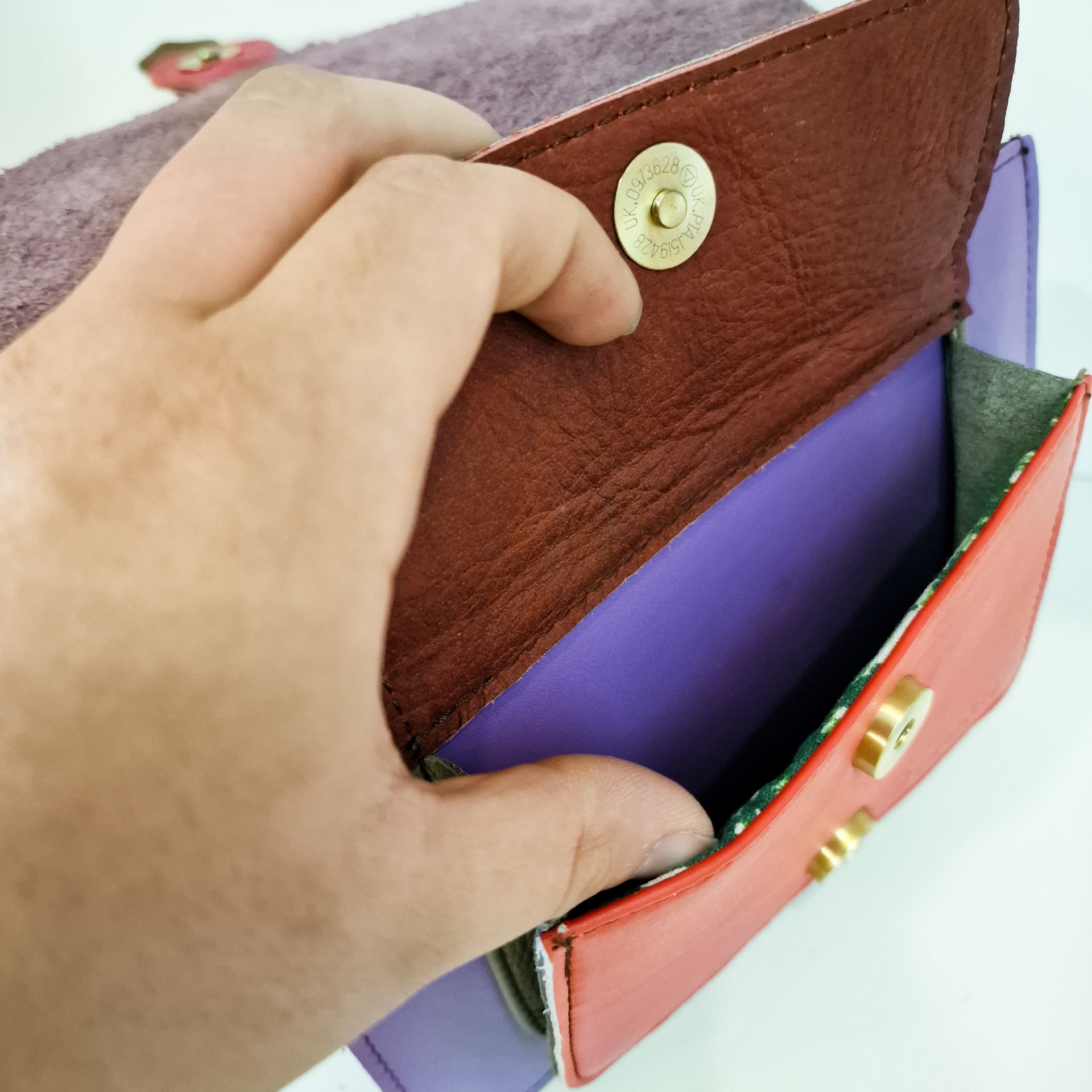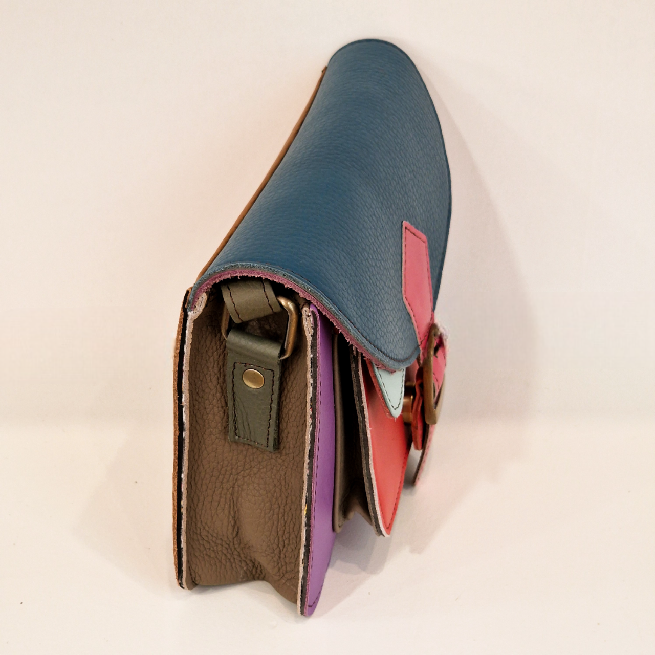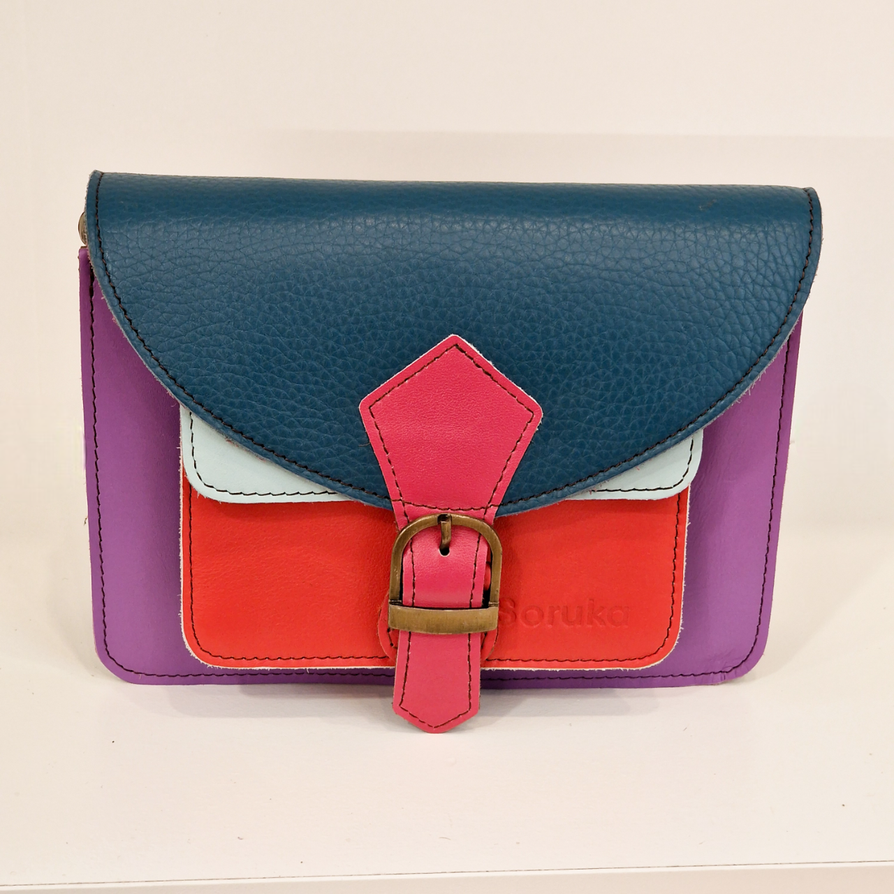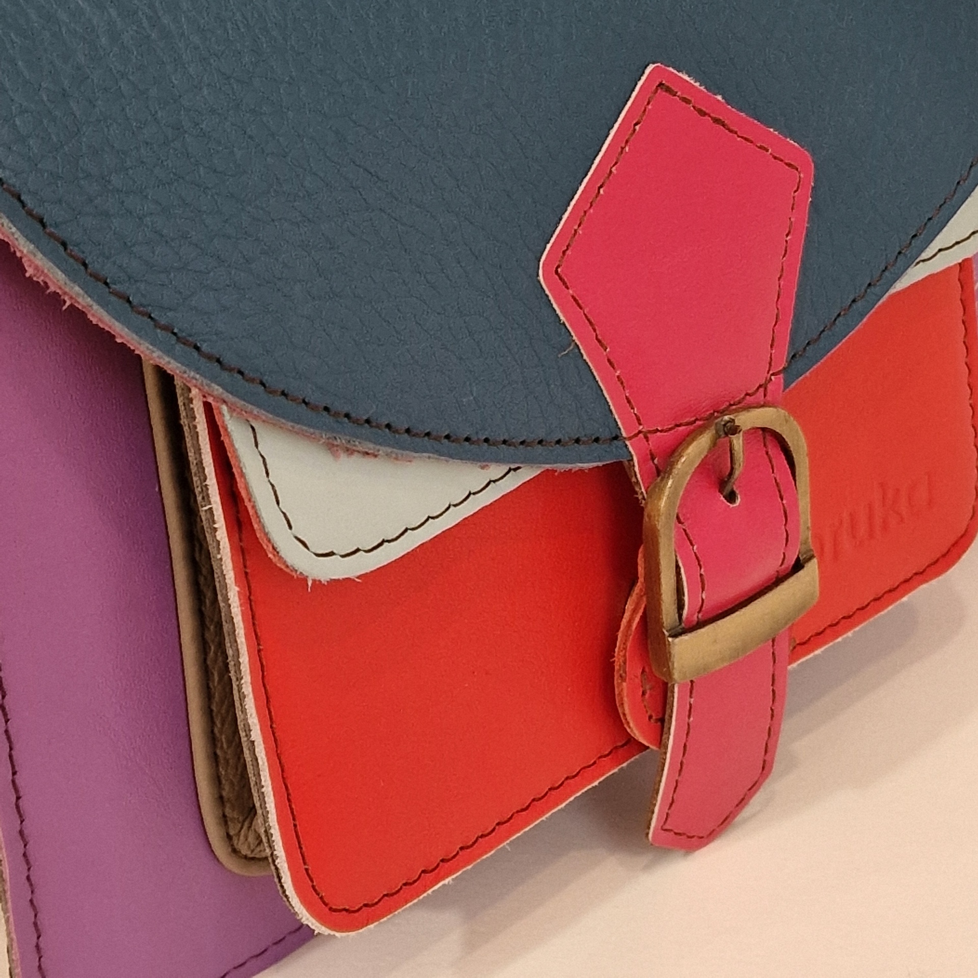 • Mala de couro multicolor com abas em várias cores e correia com fivela dourada
