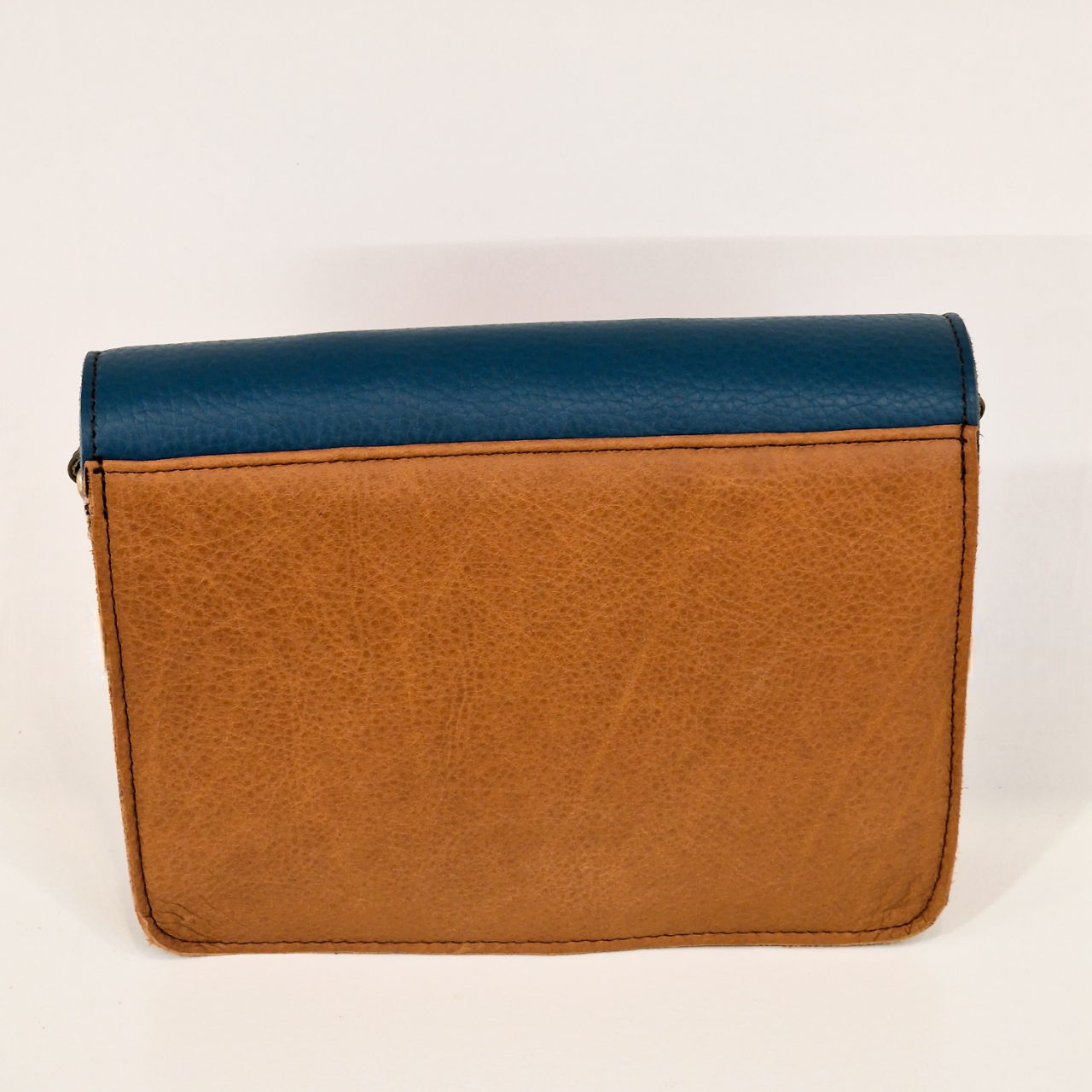 • Mala tiracolo multicolor em pele com blusa azul e castanha com padrão geométrico e saia azul escura