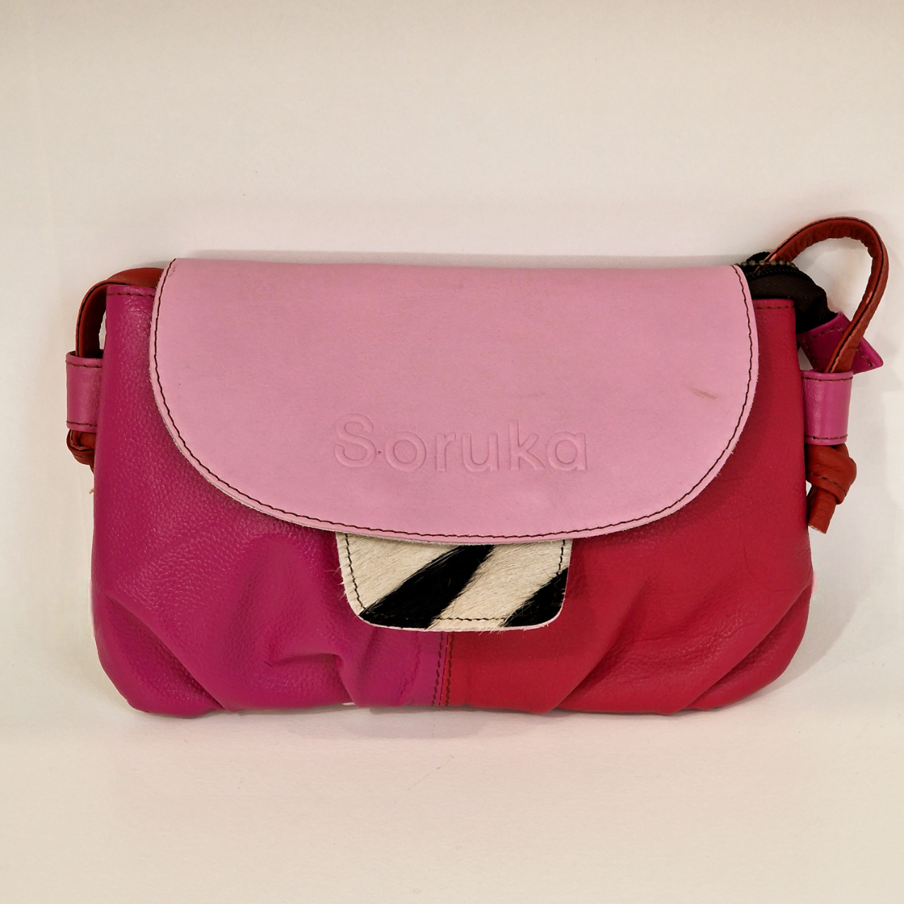 • Mala pequena de senhora em pele rosa e vermelho com aba rosa clara gravada 'Soruka'