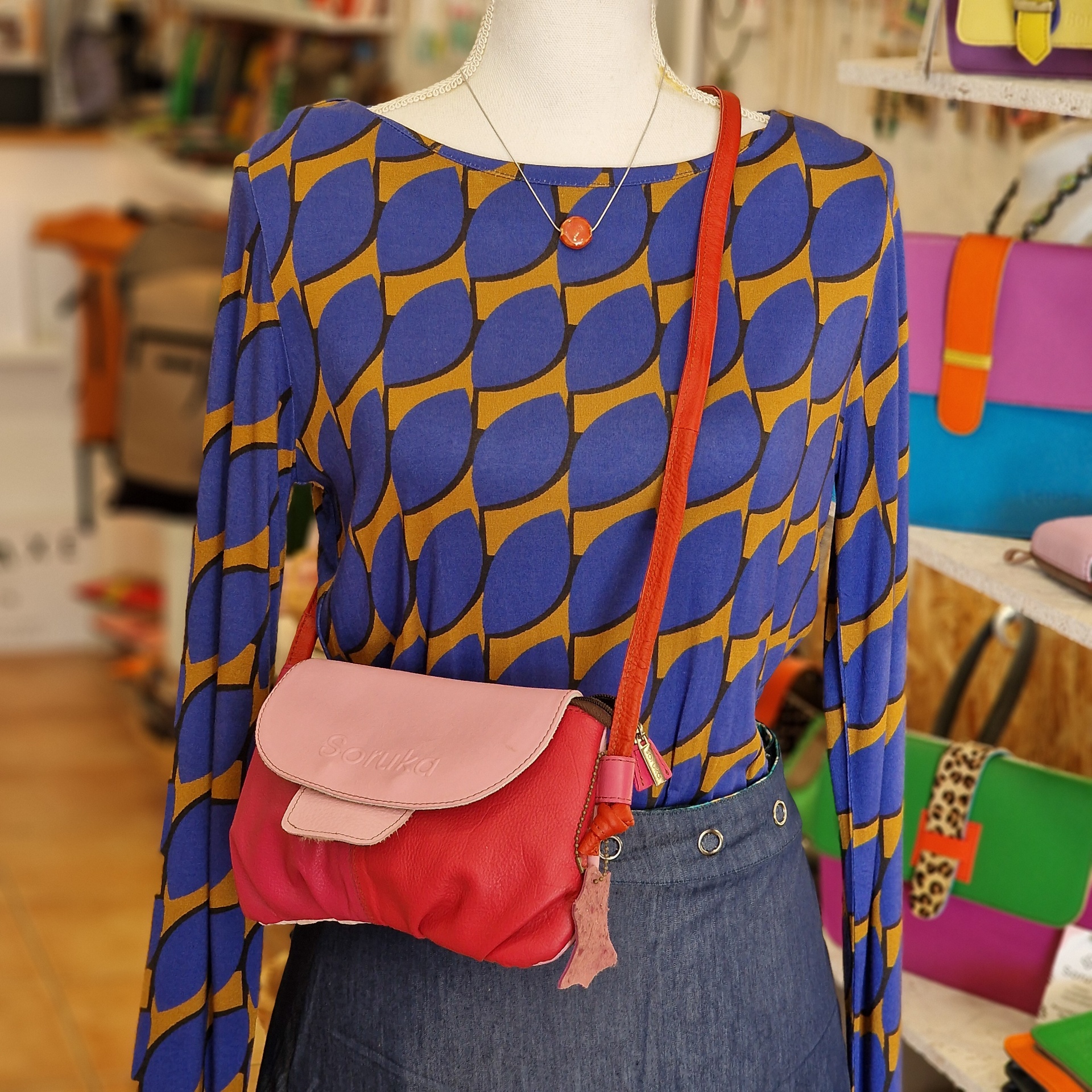 • Manequim com blusa azul e castanha, saia azul e bolsa rosa/vermelha com correia vermelha