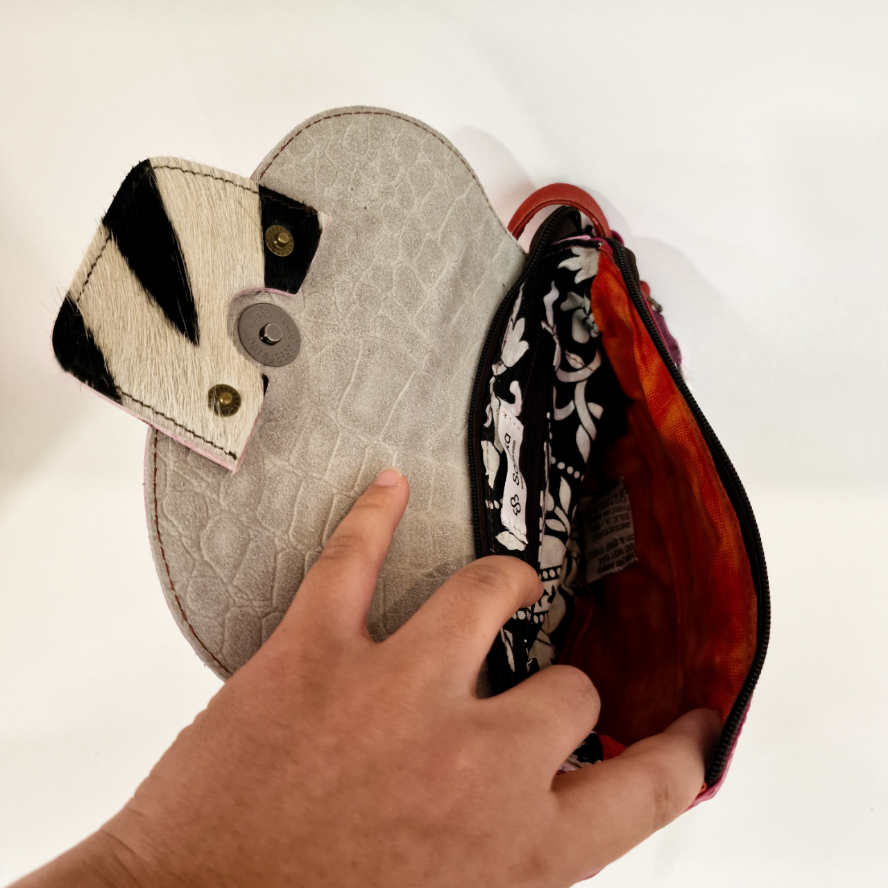 • Mala pequena aberta com interior colorido e fecho com padrão animal