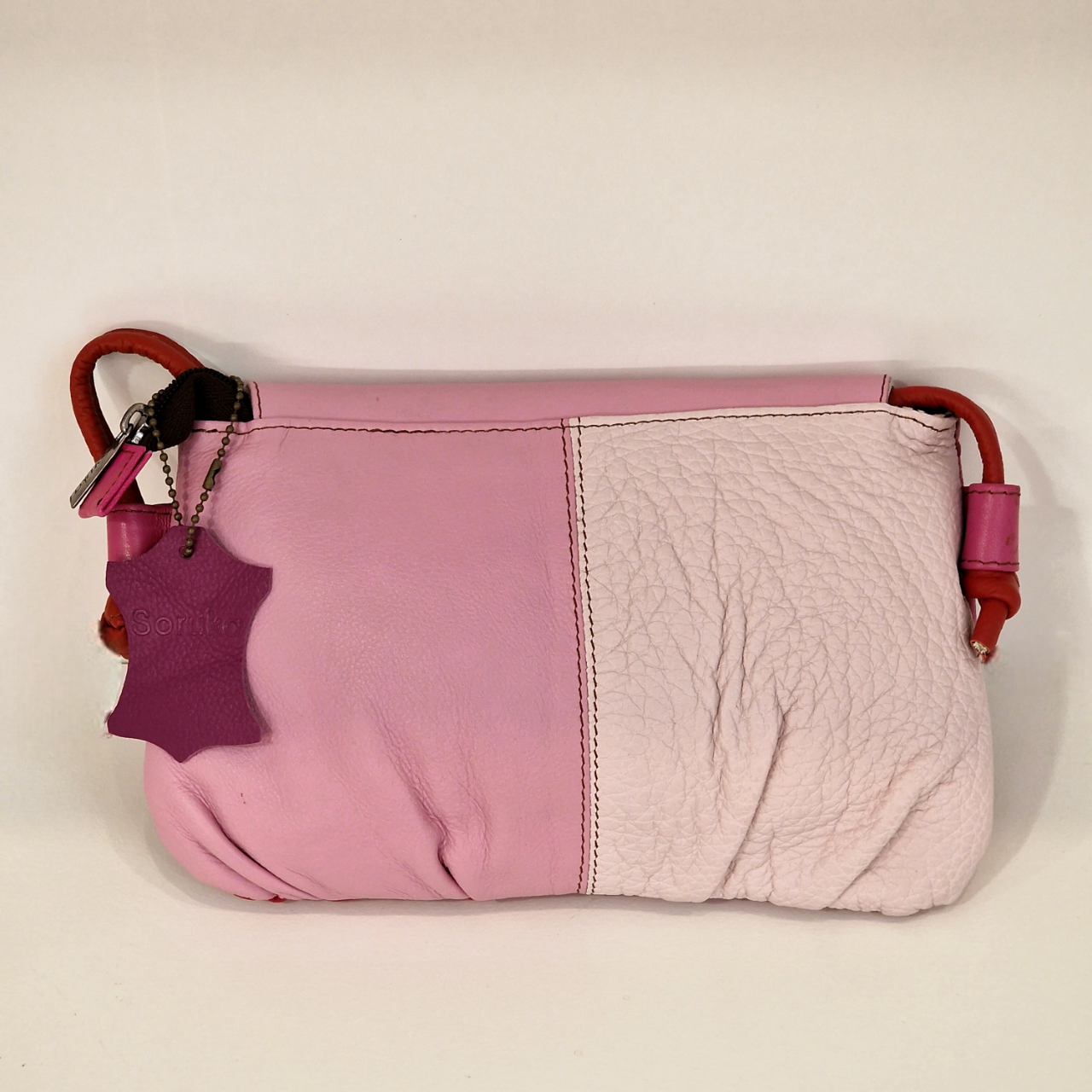 • Bolsa de mão em couro rosa claro e escuro com alça vermelha e pendente roxo