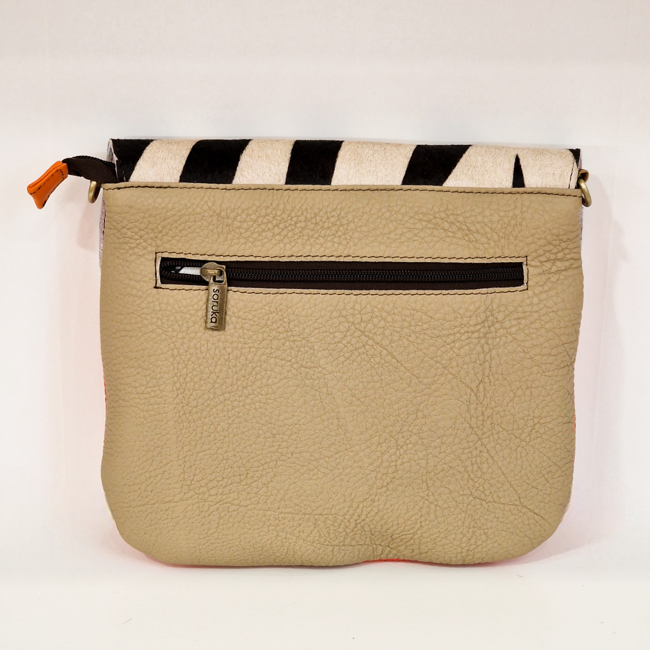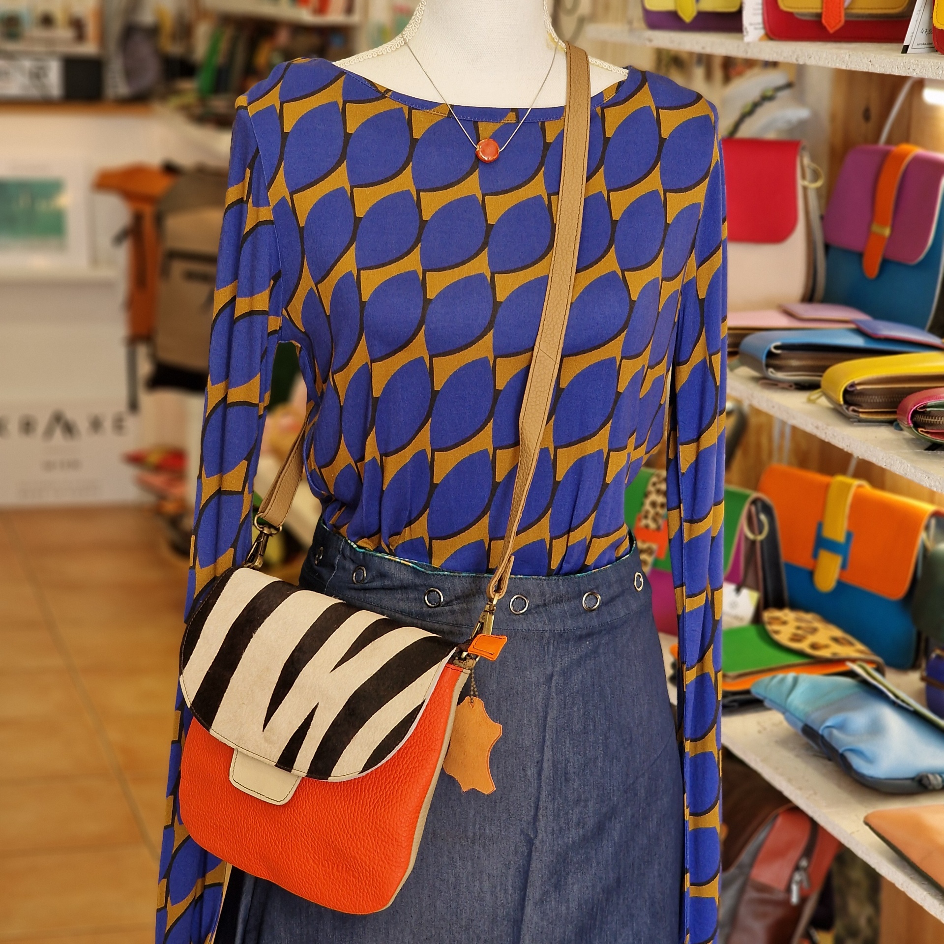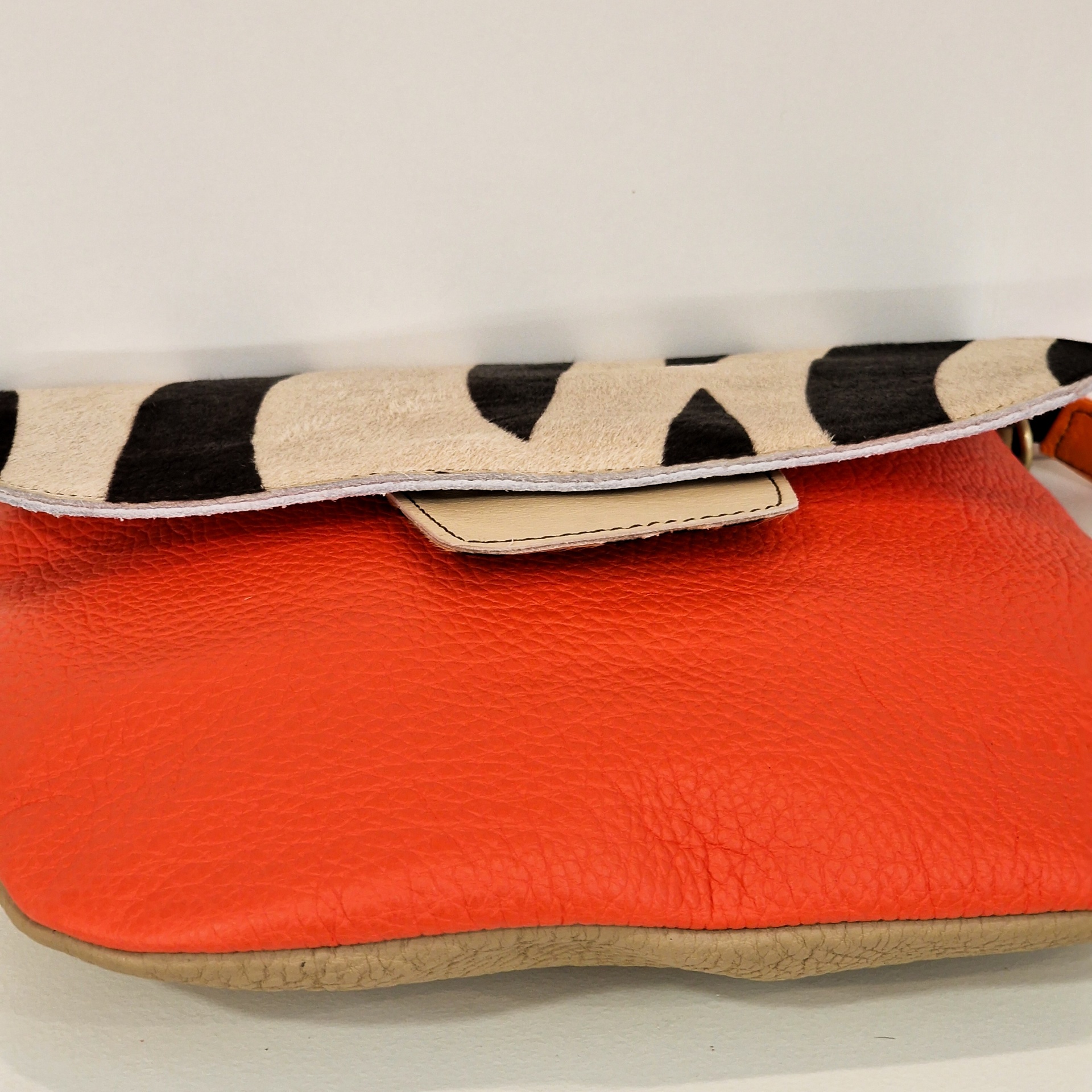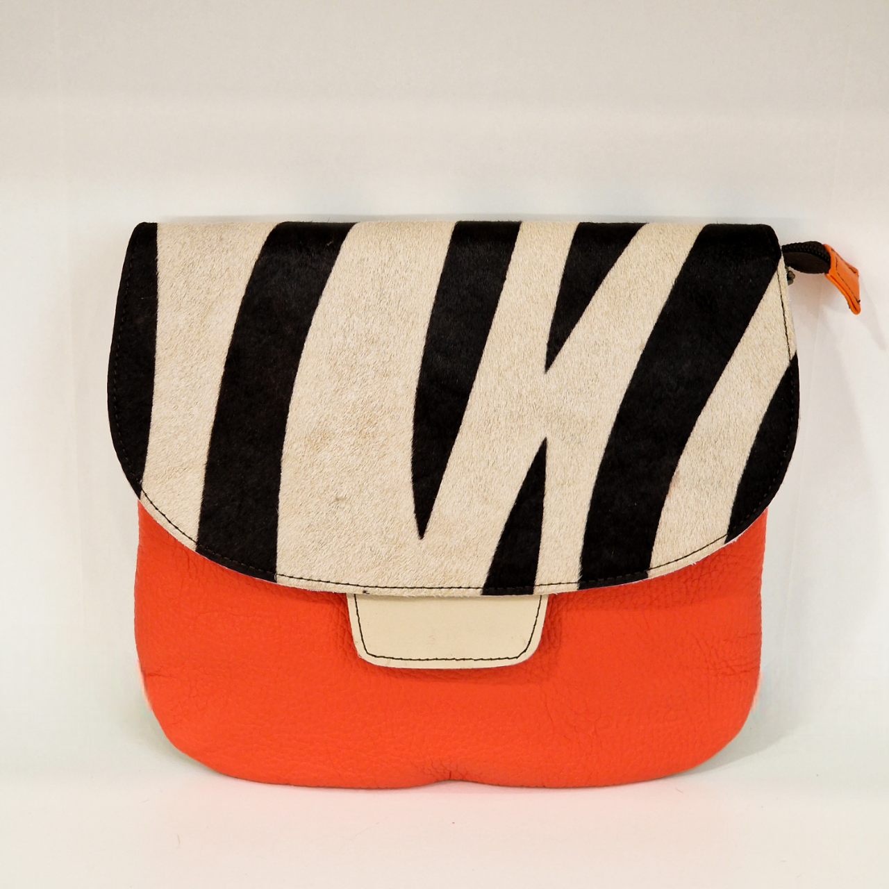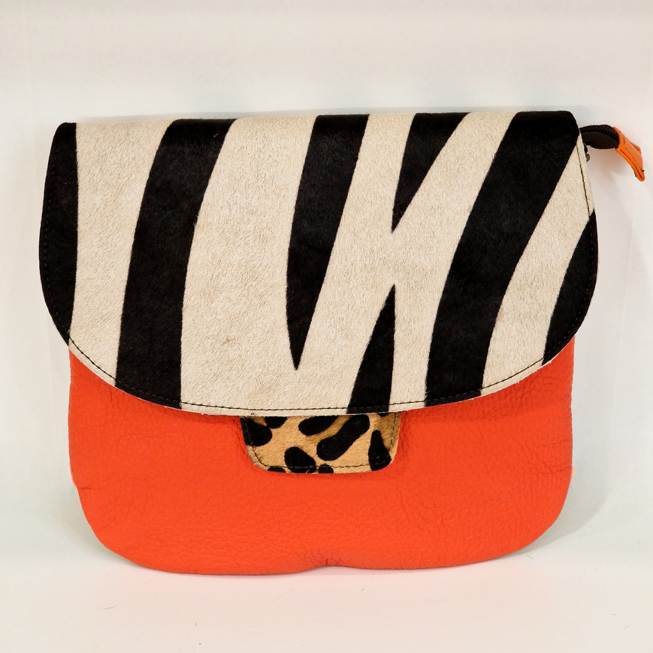 • Mala de ombro em pele laranja e padrão zebra numa loja