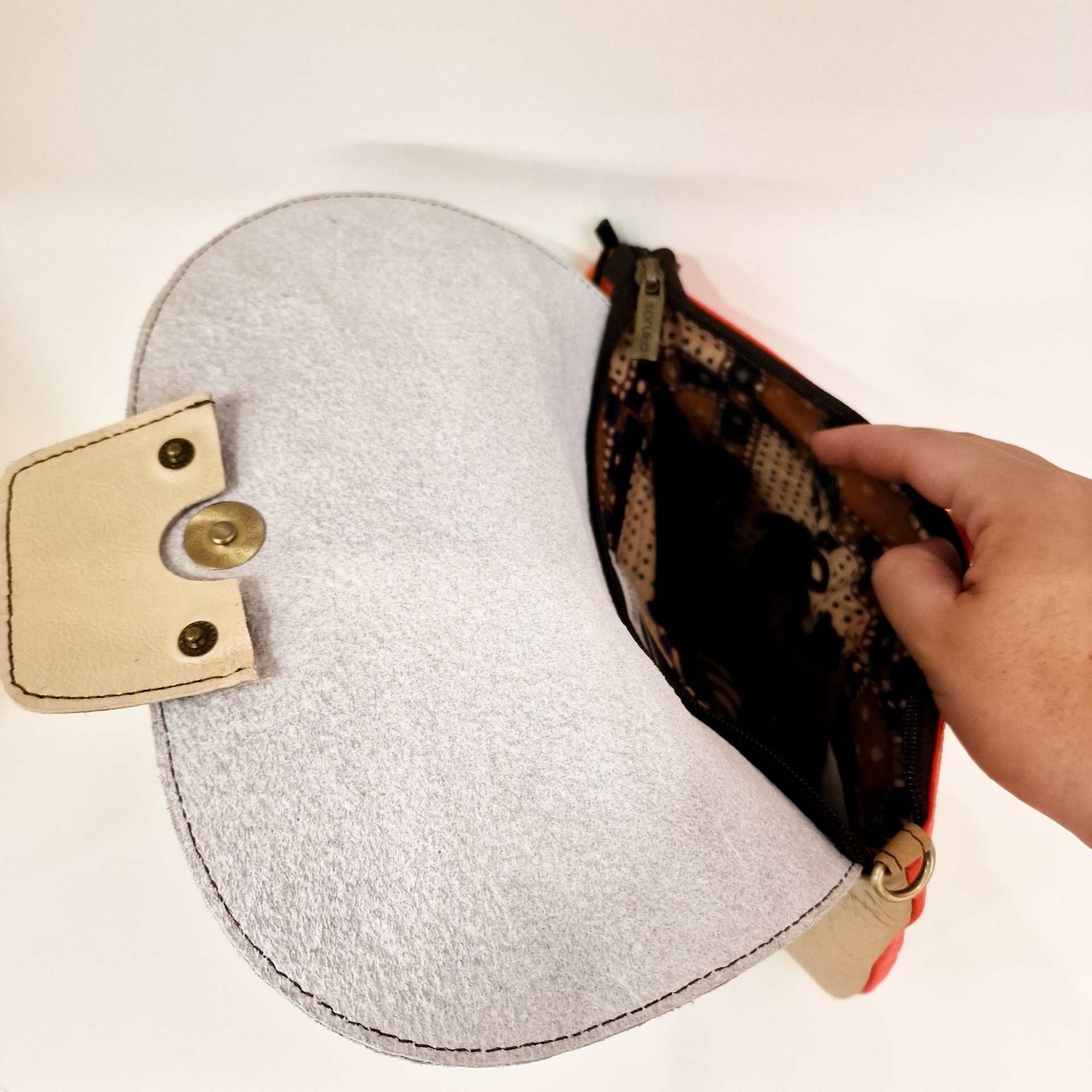 • Mala de mão vermelha com aba padrão zebra e detalhe de manchas negras no fecho