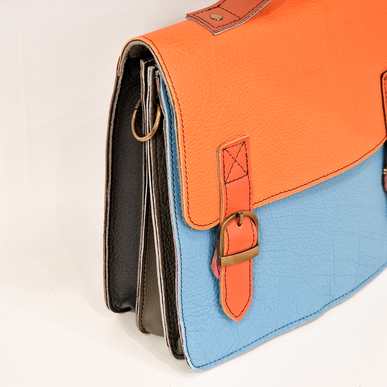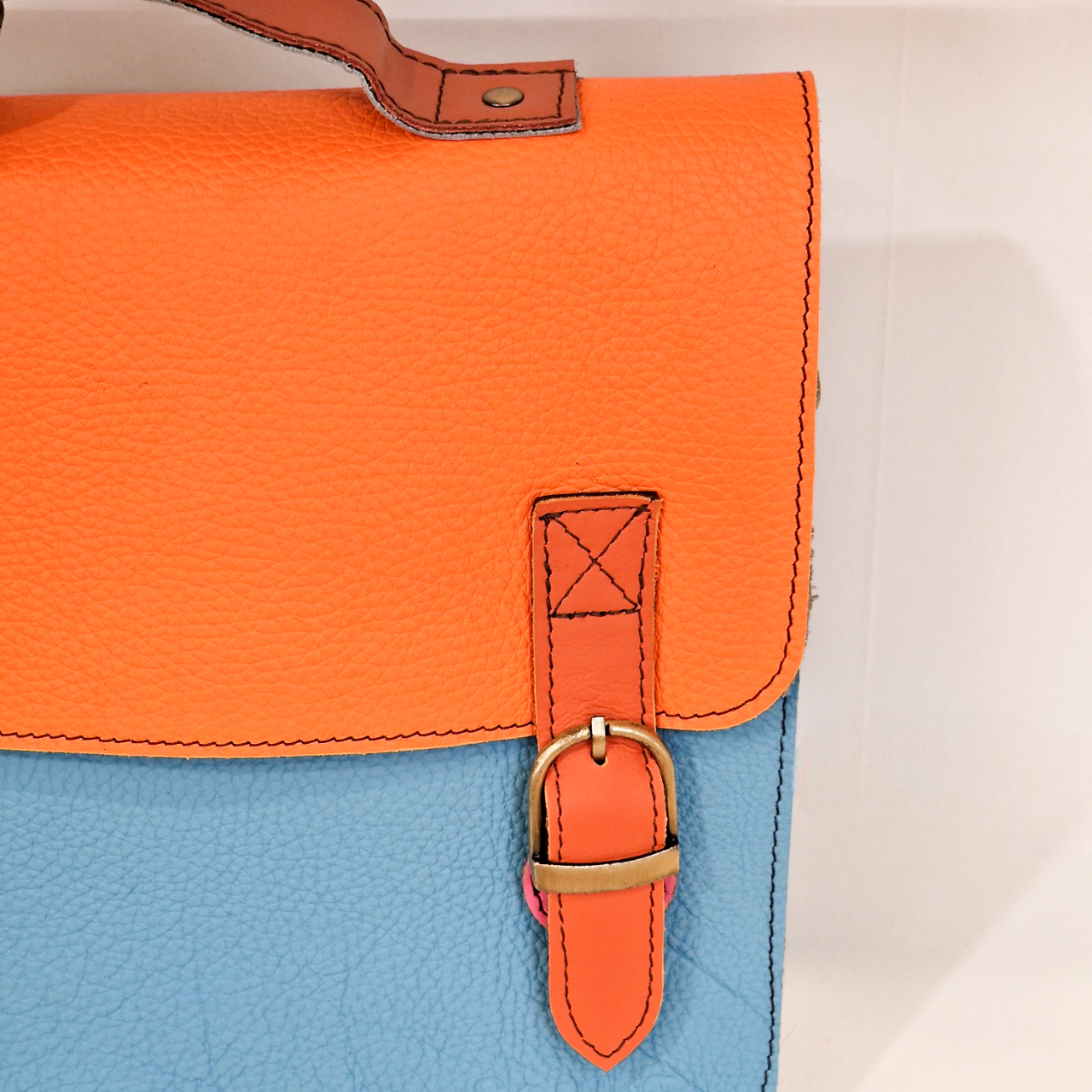 • Mala de couro azul claro com aba e detalhes em couro laranja e fecho de fivela