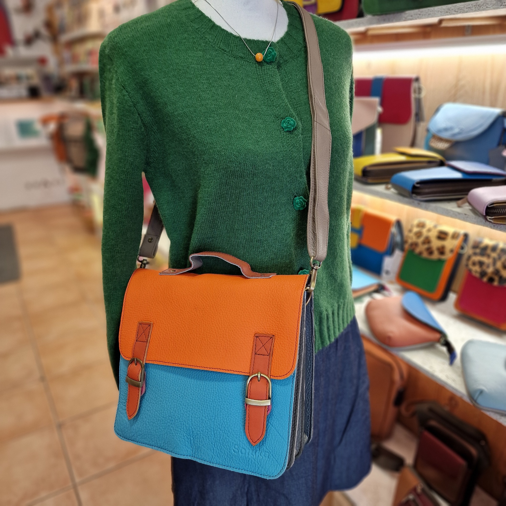 • Mala de pele laranja e azul numa loja, exposta em manequim com cardigan verde e saia azul