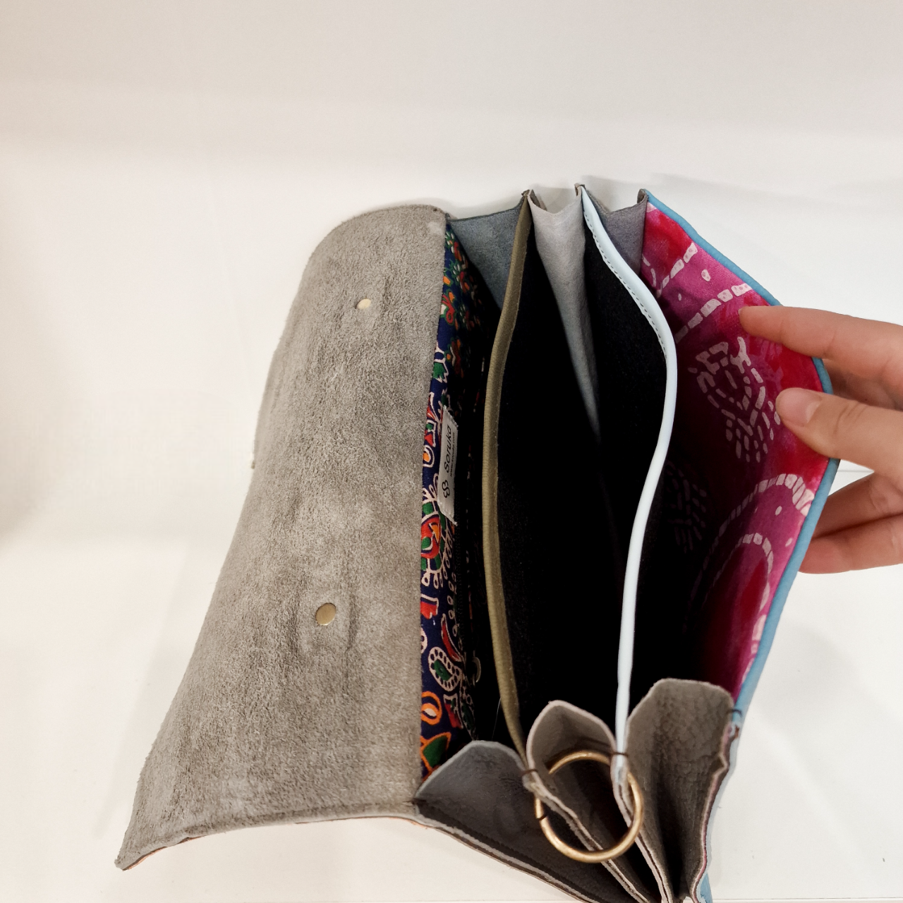 • Carteira cinzenta com interior colorido e padrão floral aberta com divisórias