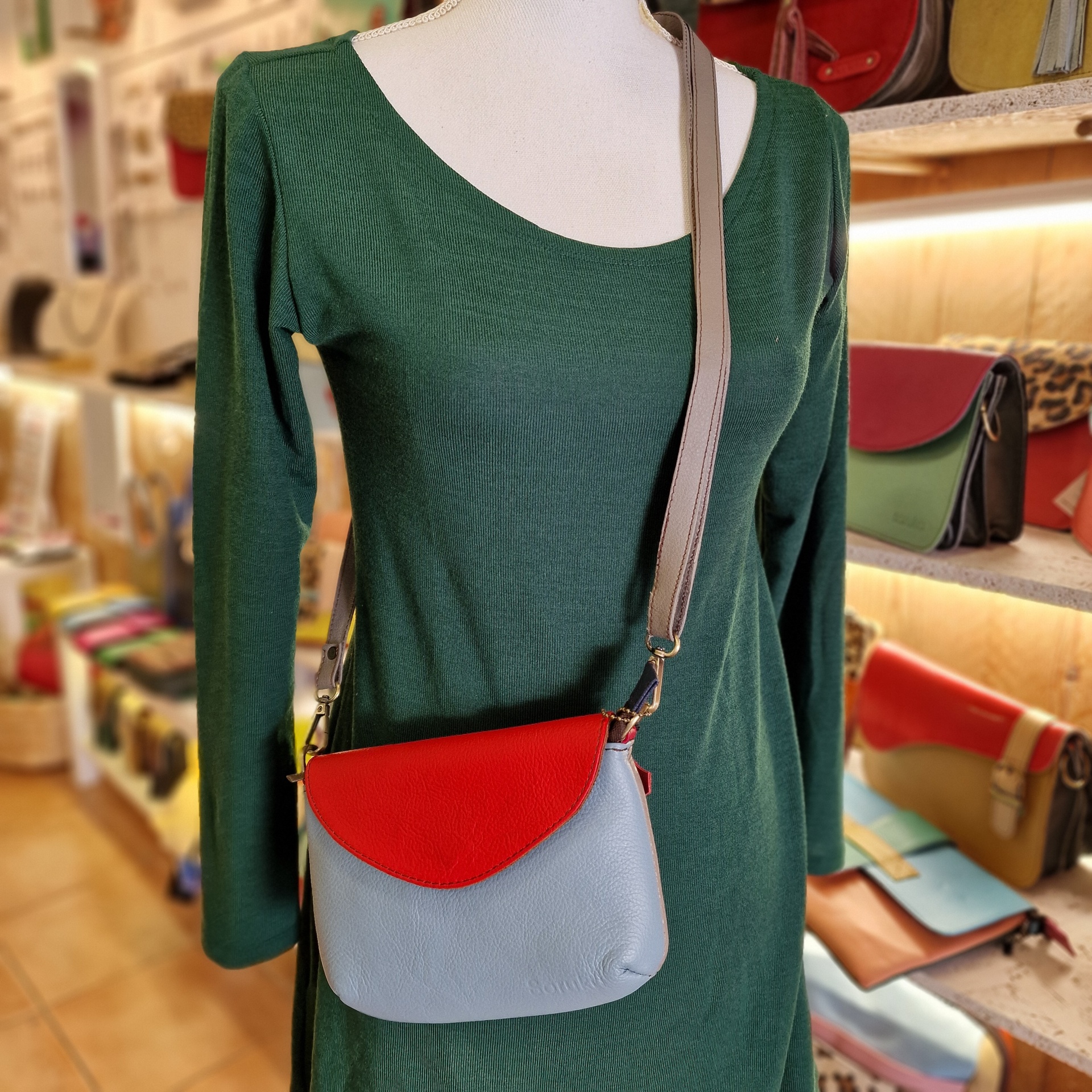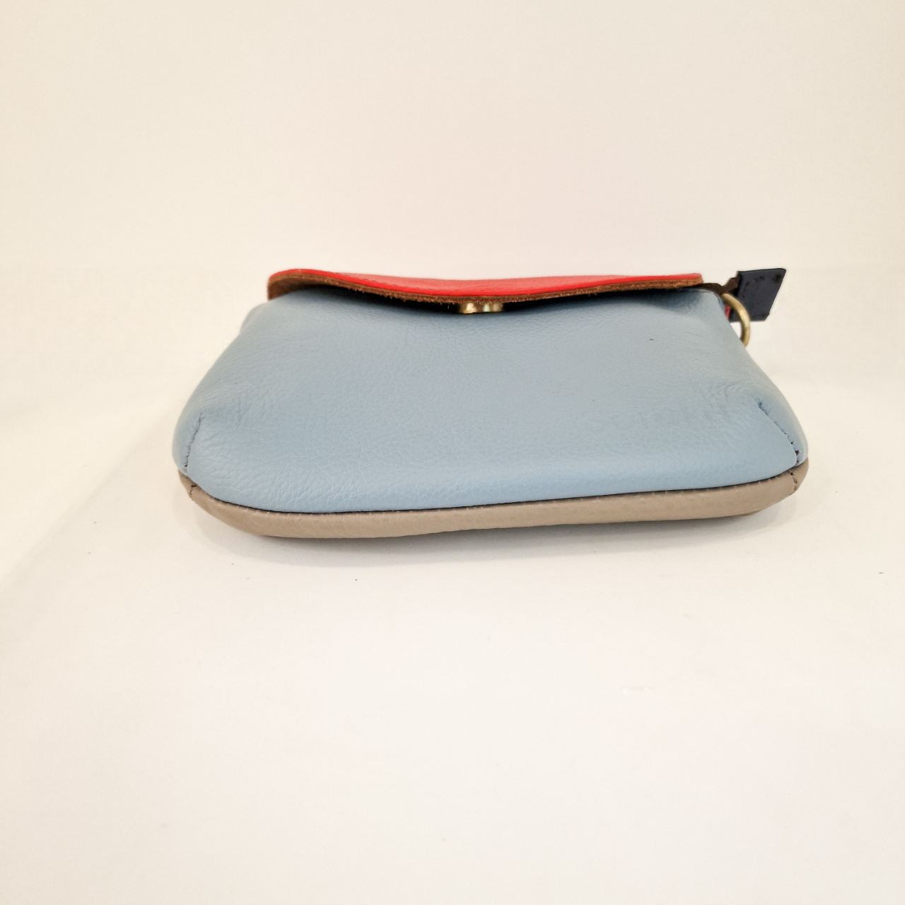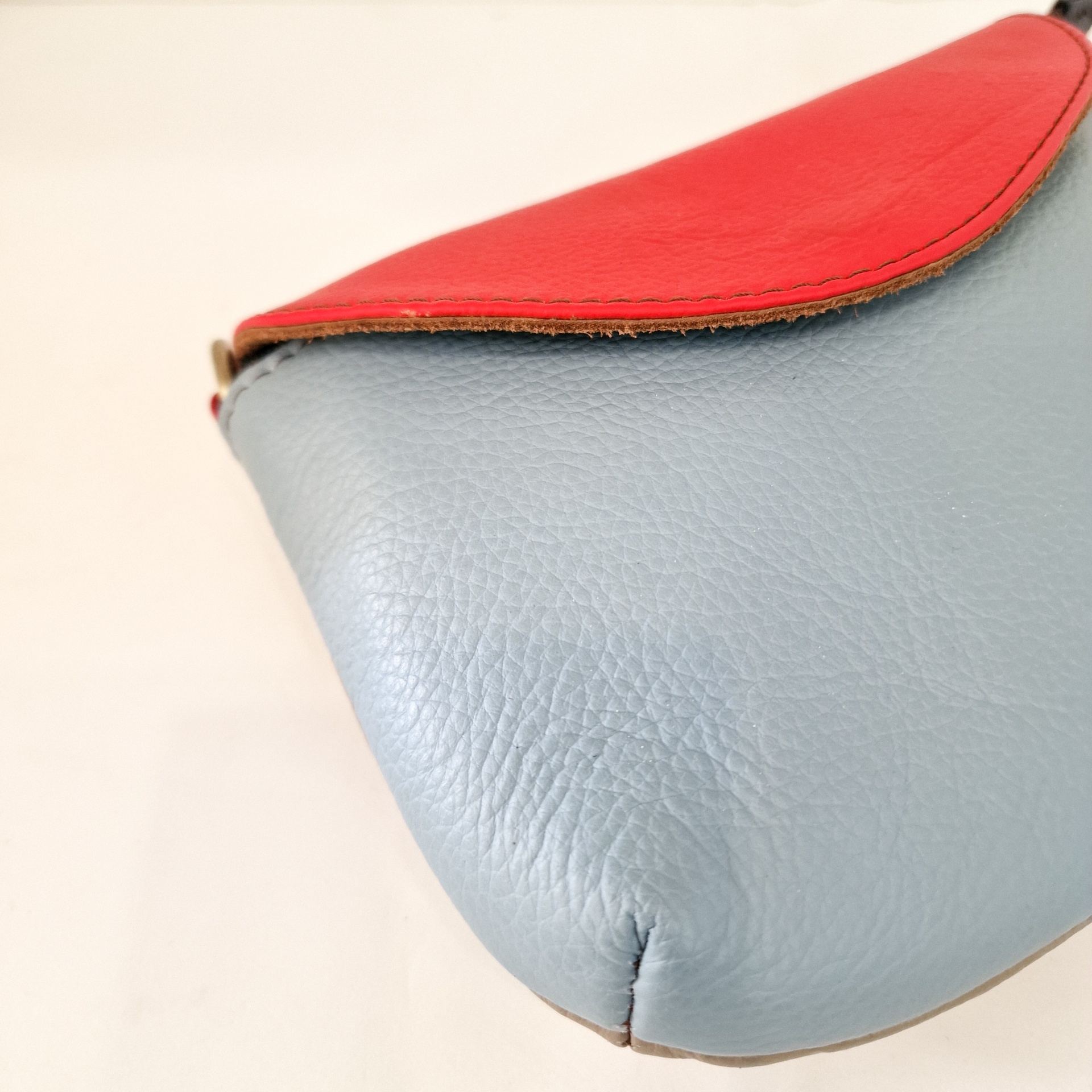 • Bolsa pequena em pele azul claro com aba vermelha e fecho dourado