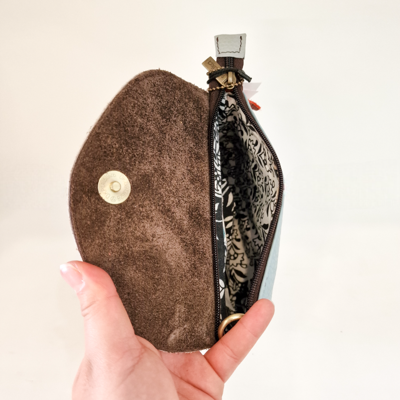 • Carteira ou porta-moedas em couro castanho com interior estampado a preto e branco