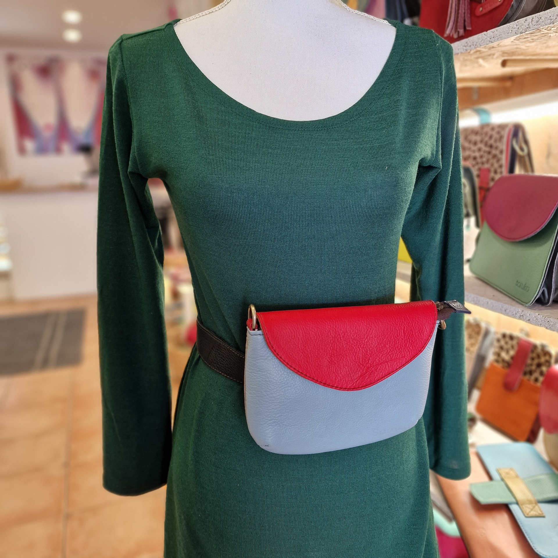 • Vestido de malha verde com bolsa tipo cinto vermelho e cinza claro numa loja