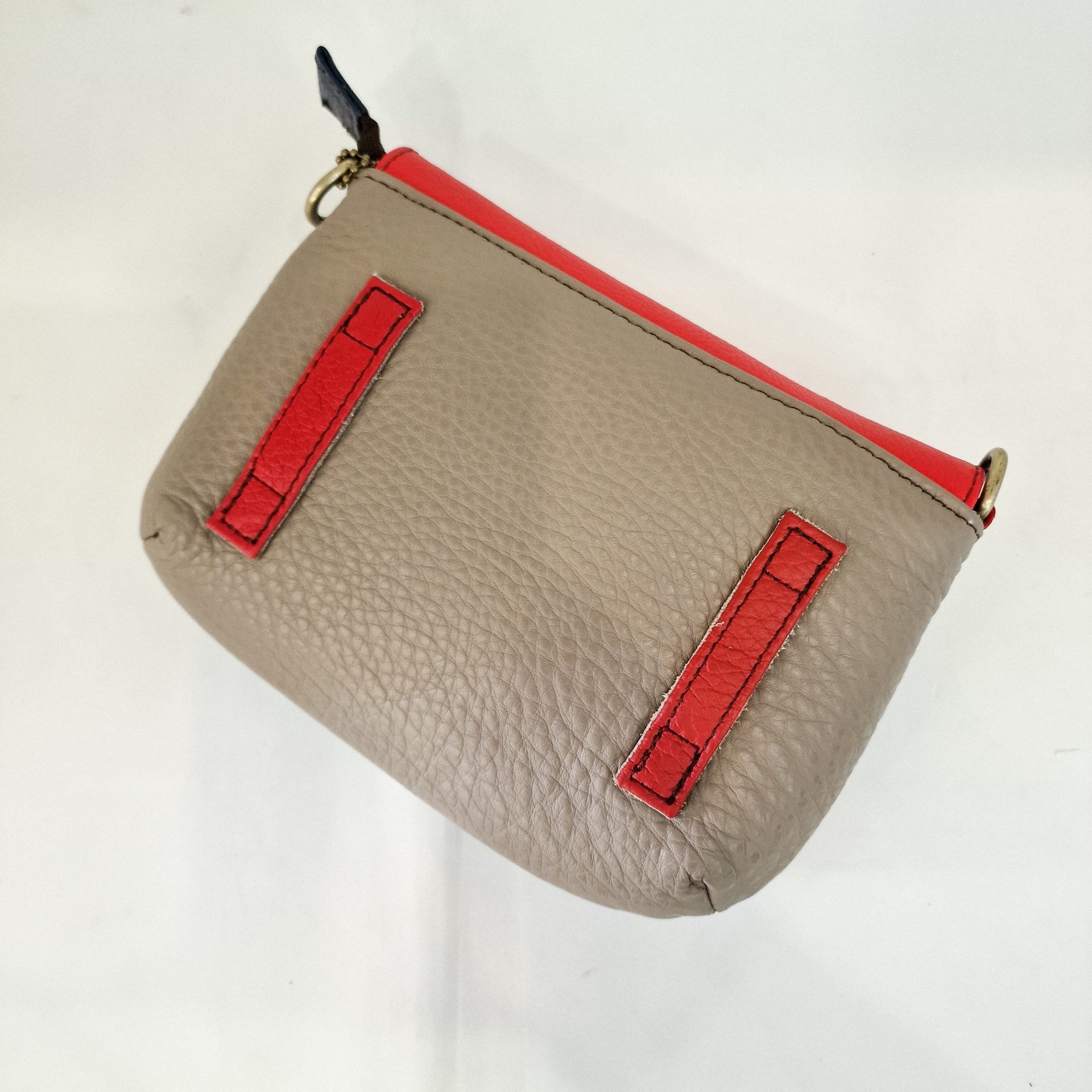 • Bolsa pequena bege com detalhes vermelhos e fecho de correr