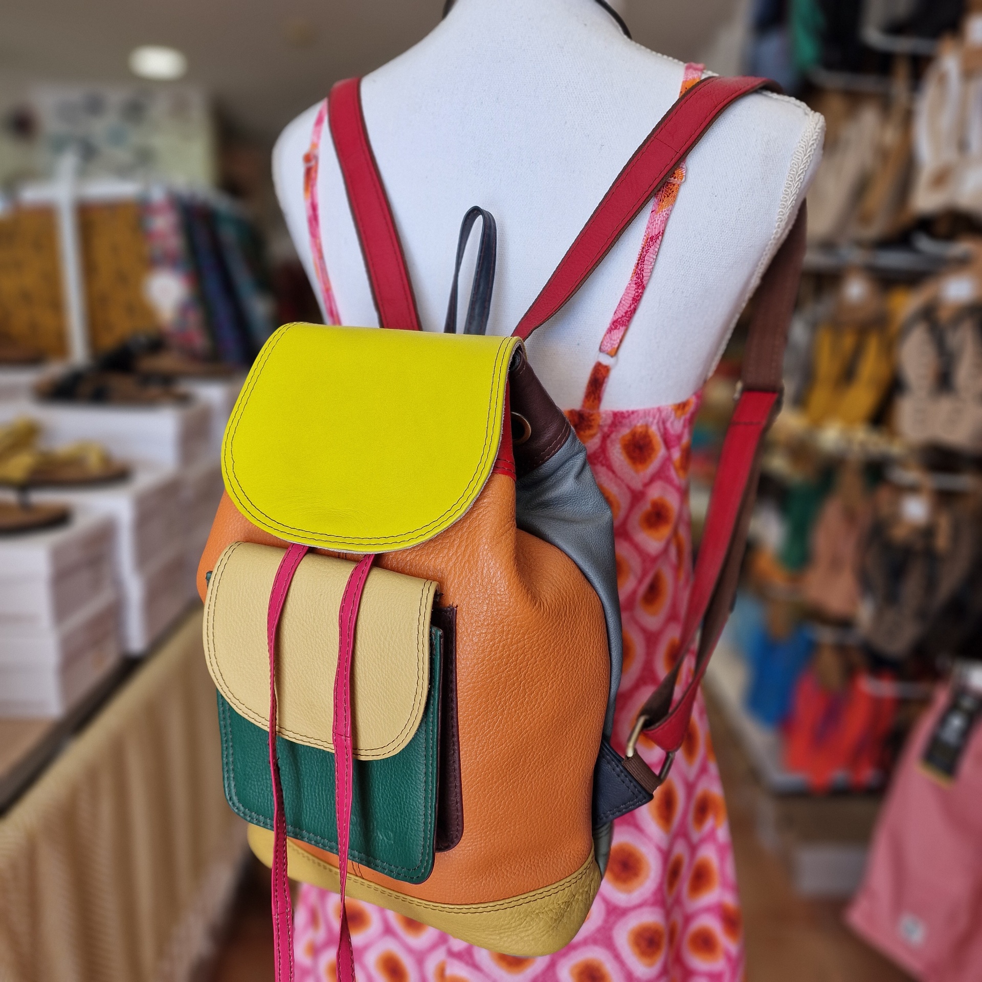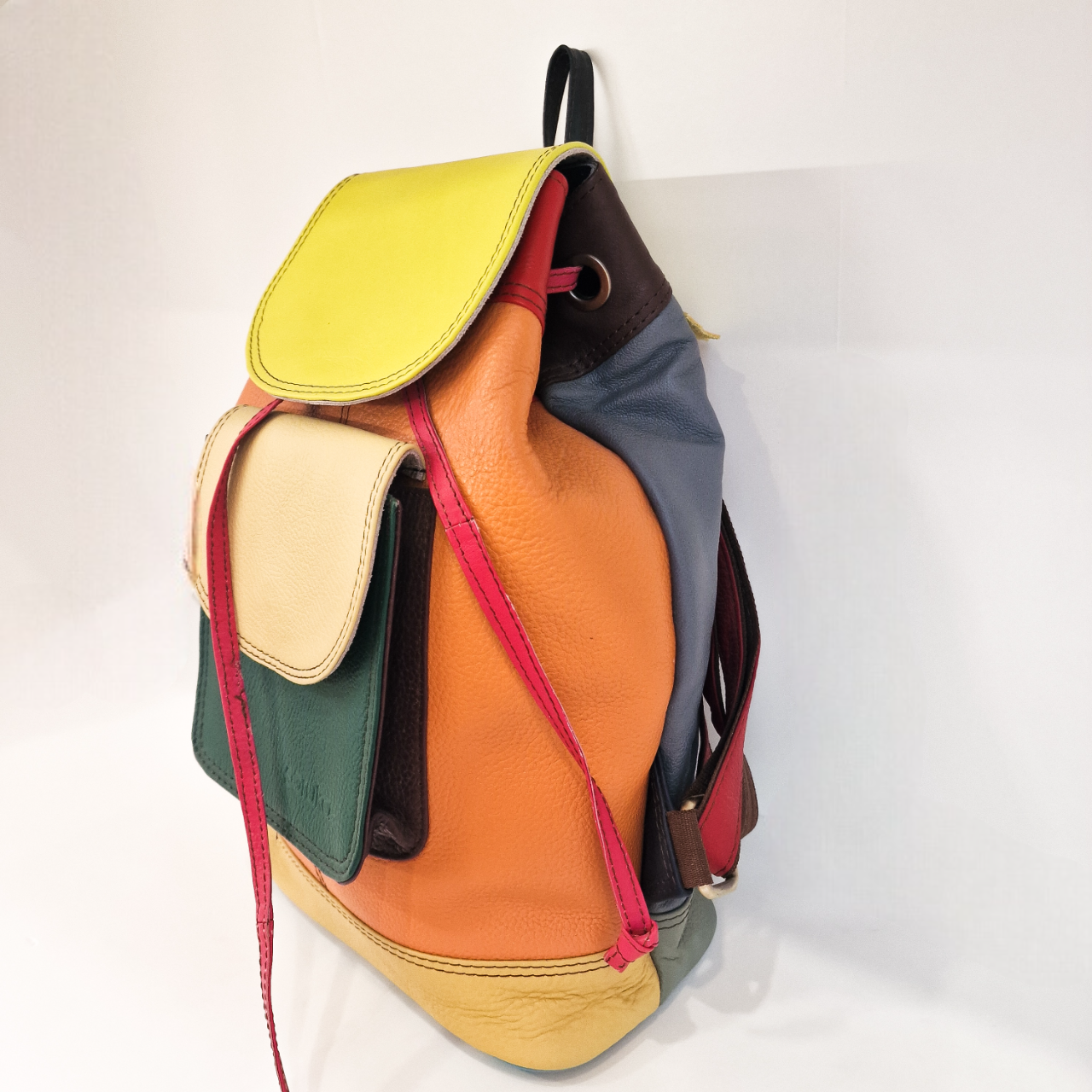 • Mochila de couro multicolor com vários bolsos e alças cor-de-rosa