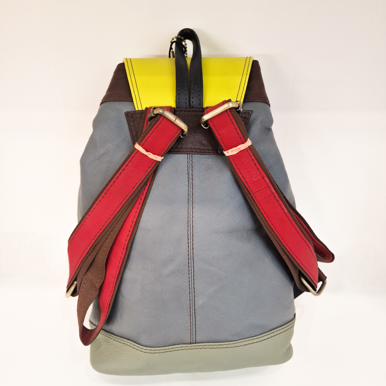 • mochila de couro colorida com alças vermelhas e castanhas sobre fundo branco