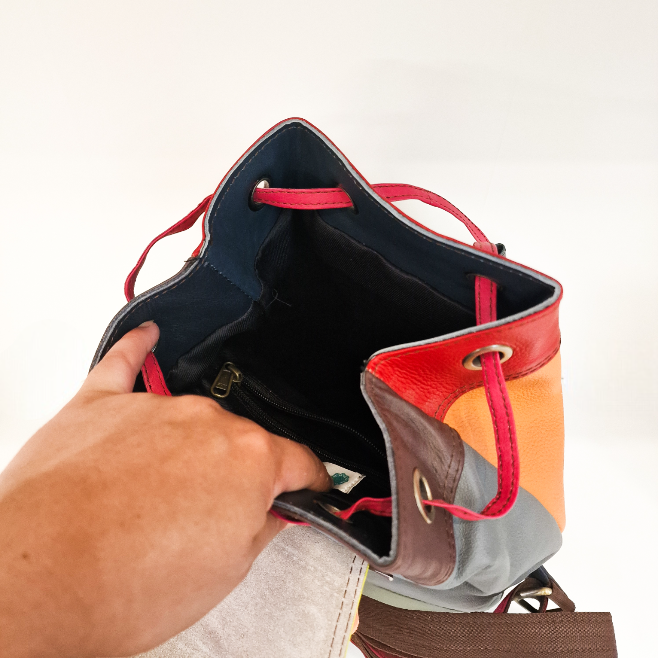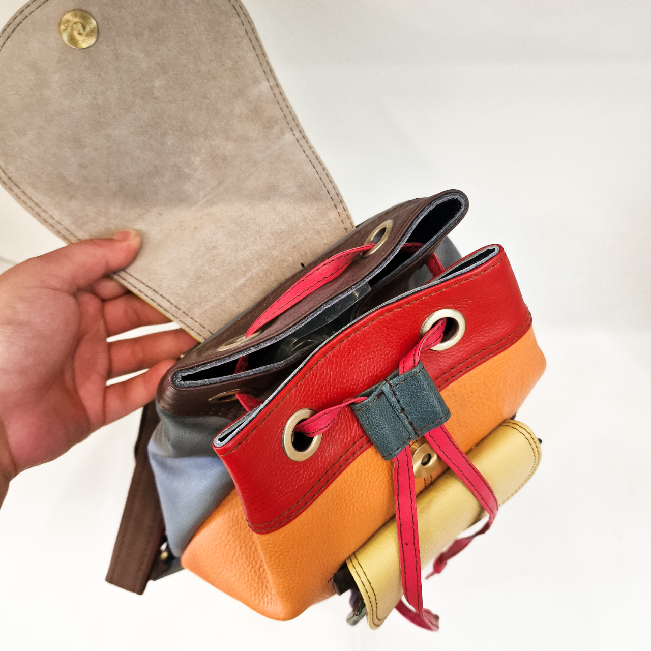 • Mala pequena colorida de couro com fecho de cordão e botão de pressão