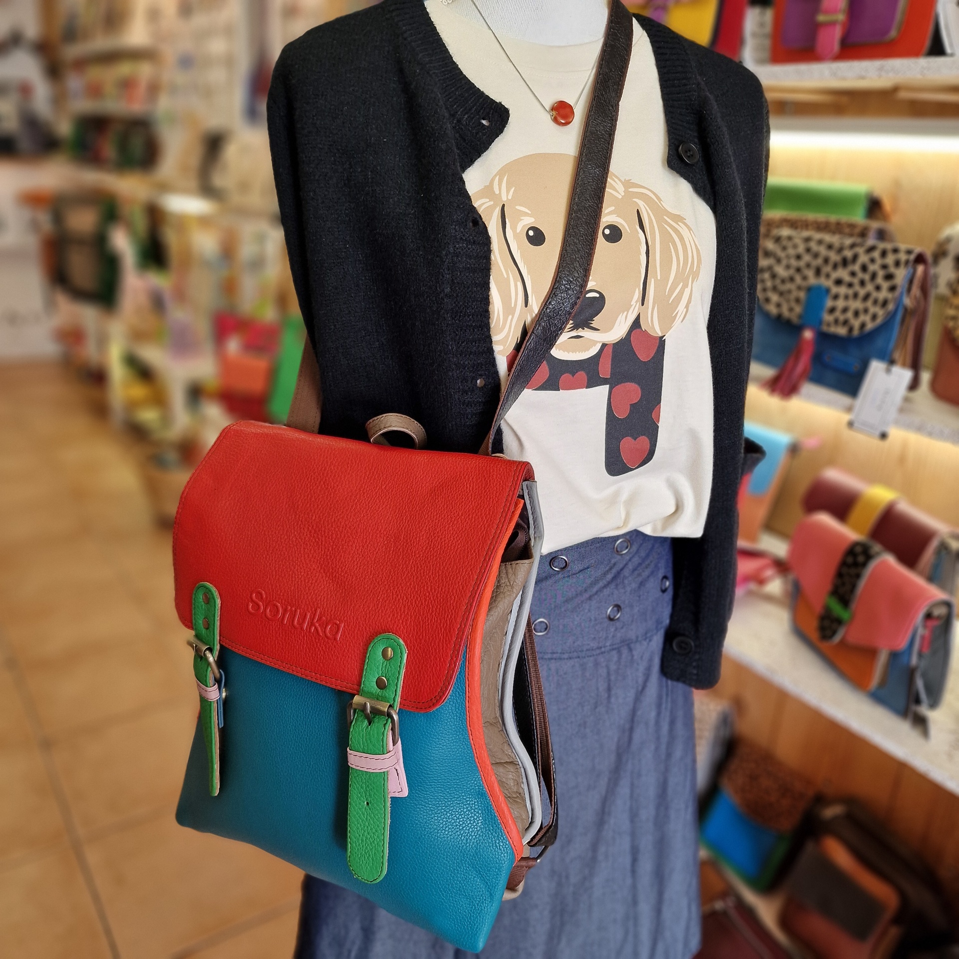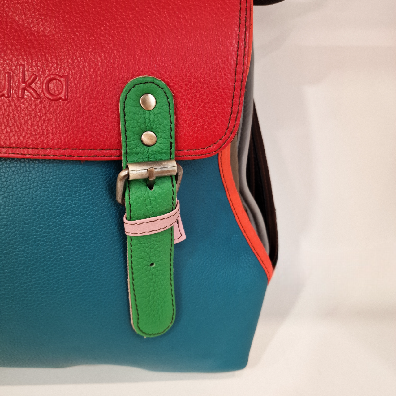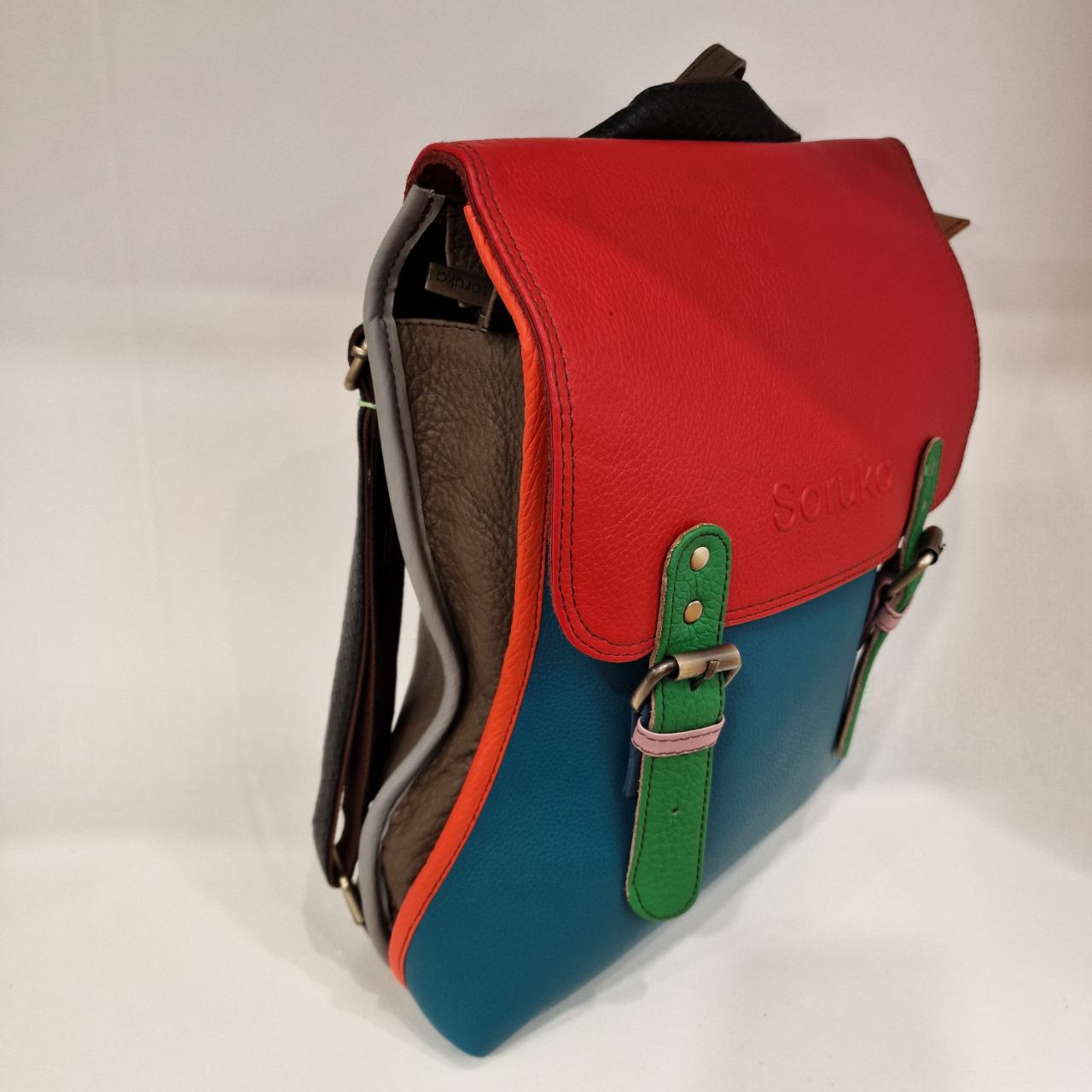• Mochila de pele vermelha, azul e verde com gravura 'Soruka' e alças em couro