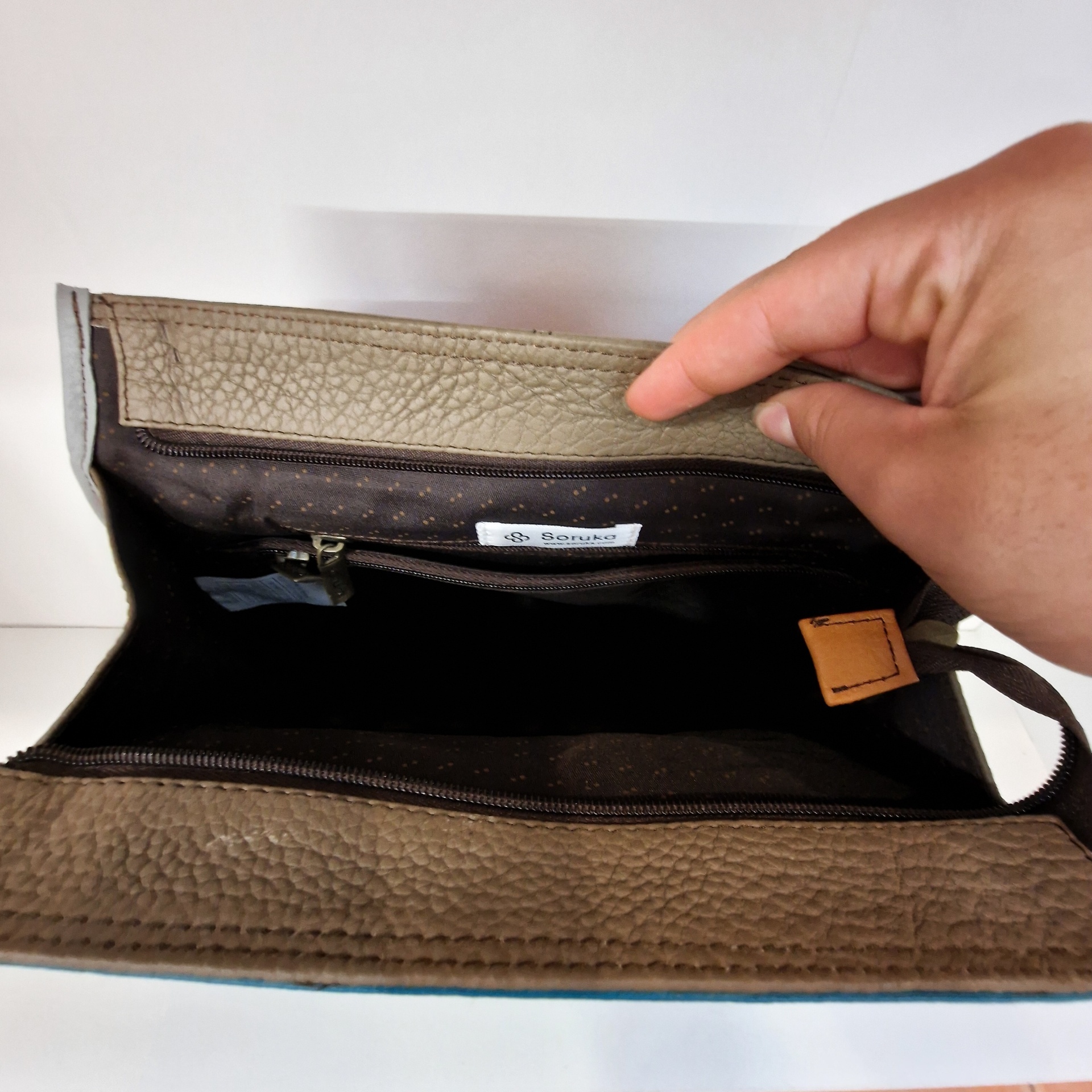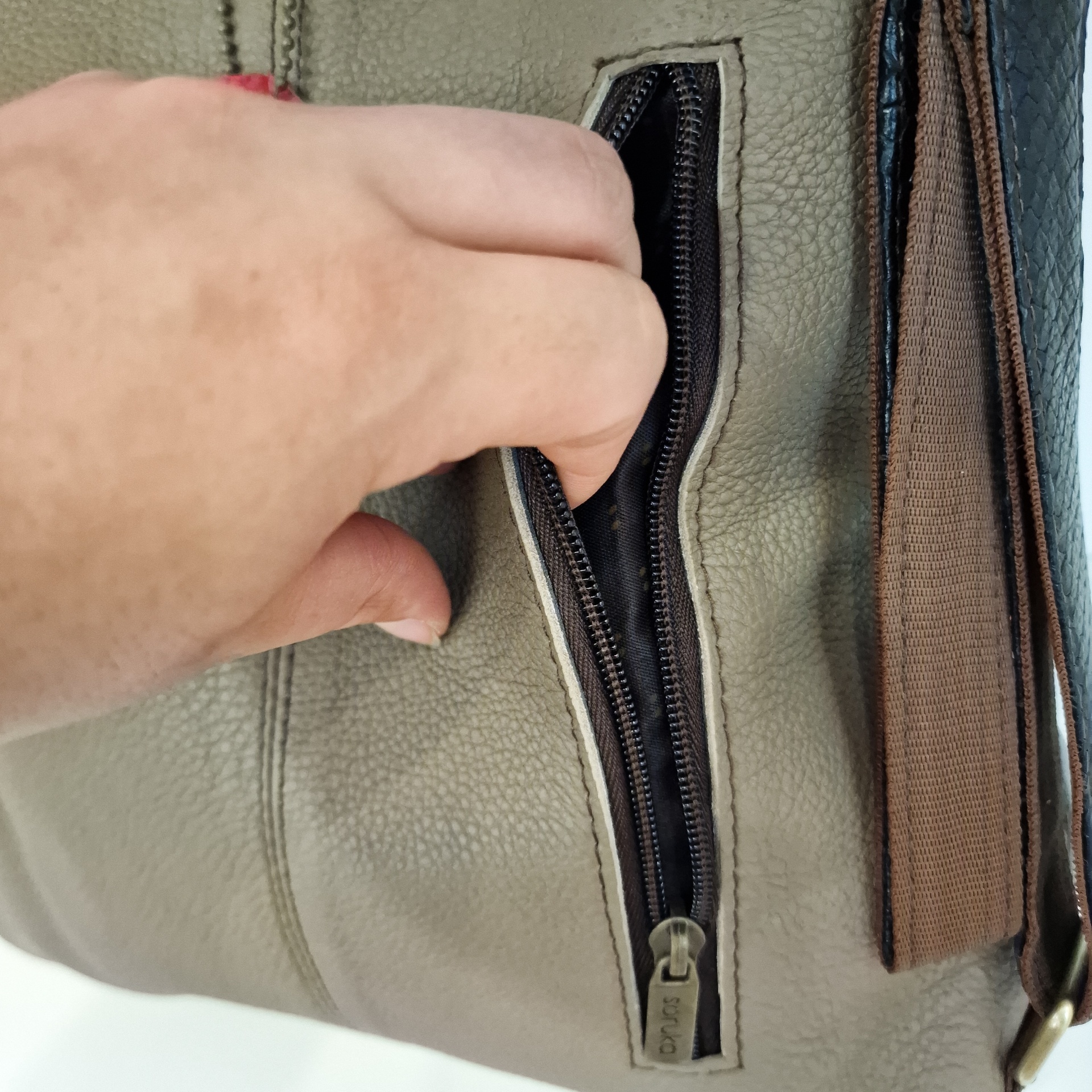 • Interior de mala castanha clara com bolso e etiqueta Soruka