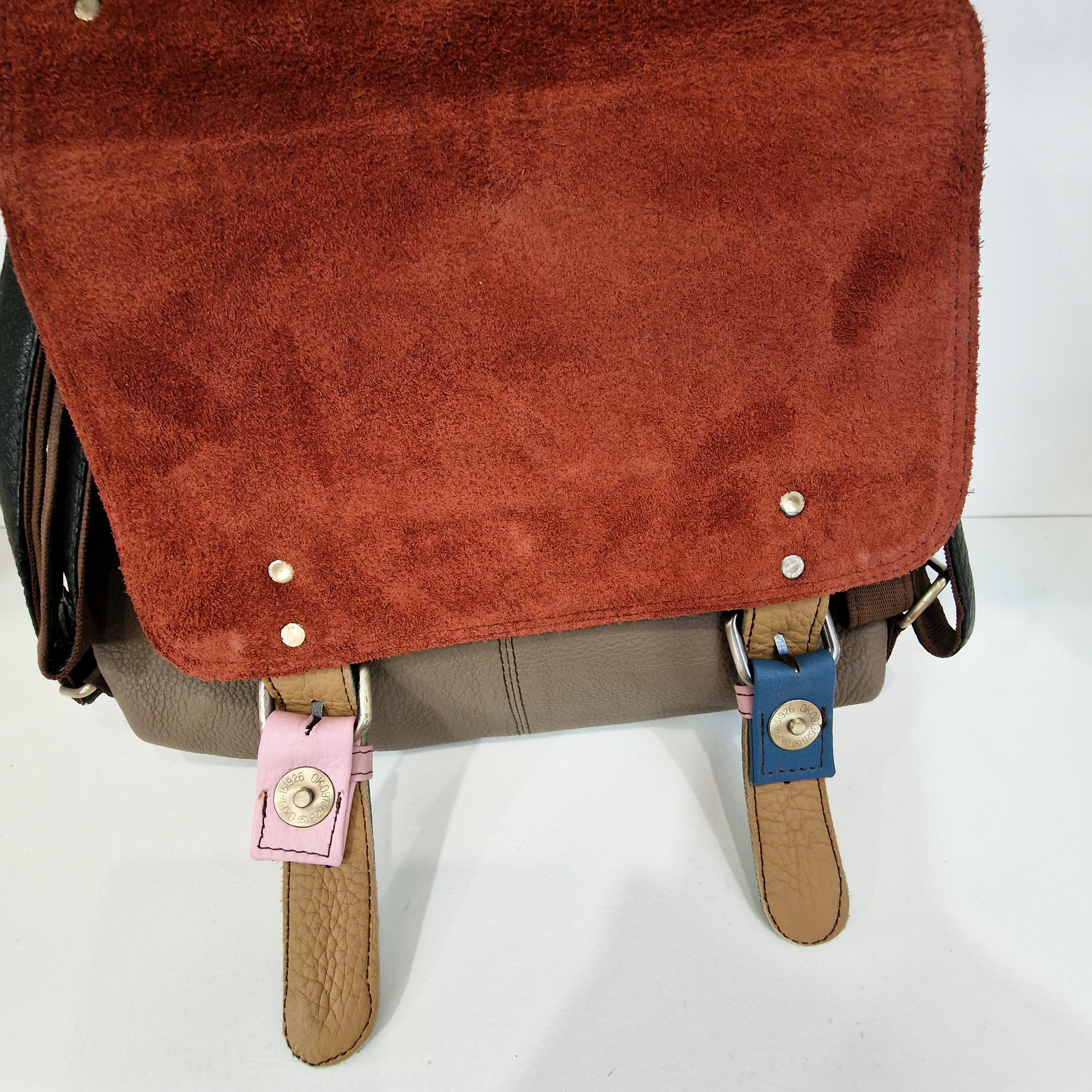 • Mala em pele bege e camurça castanha com fivelas em pele castanha e detalhes rosa e azul