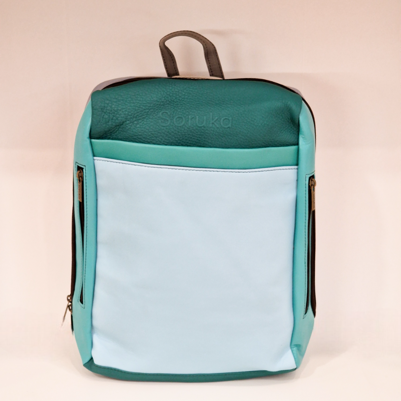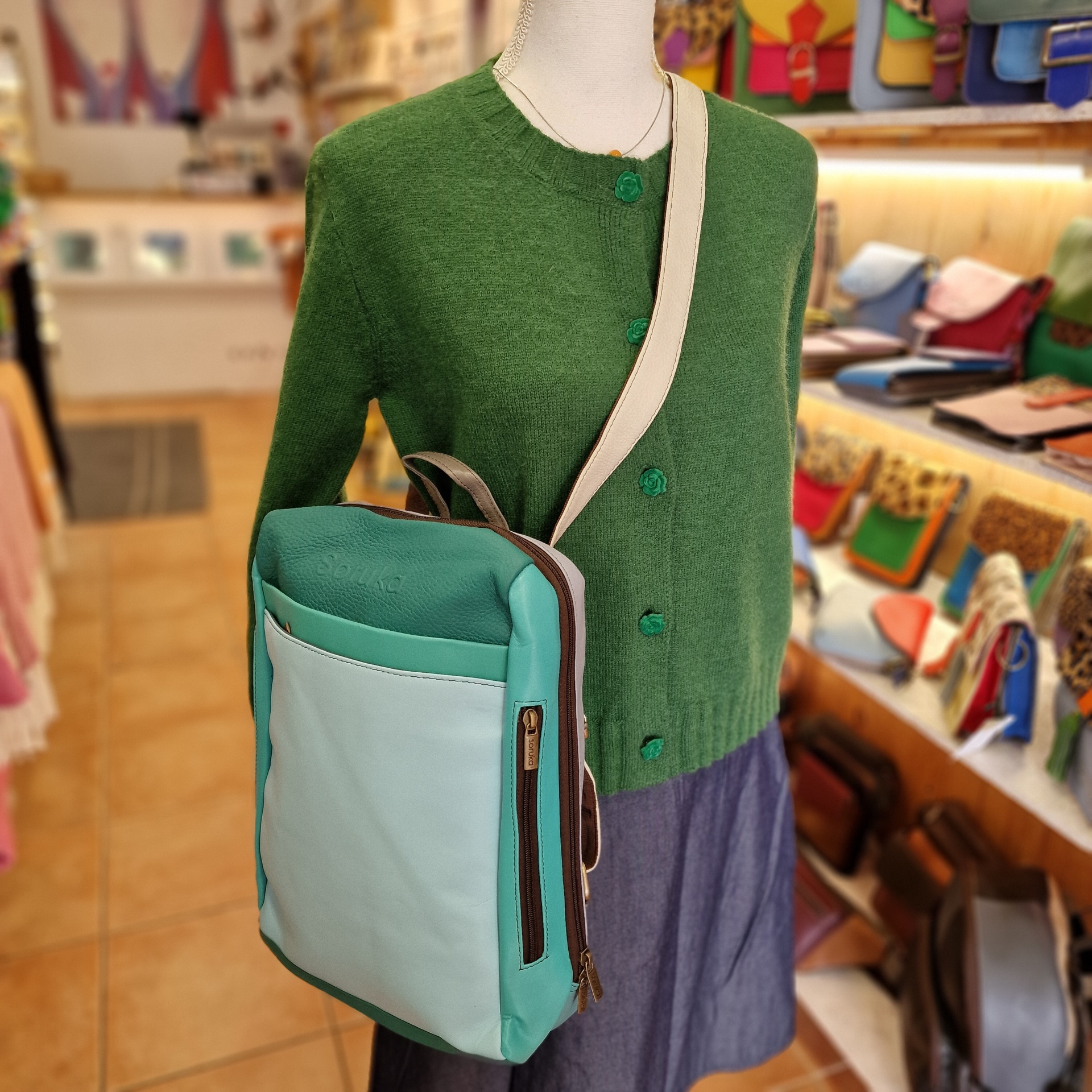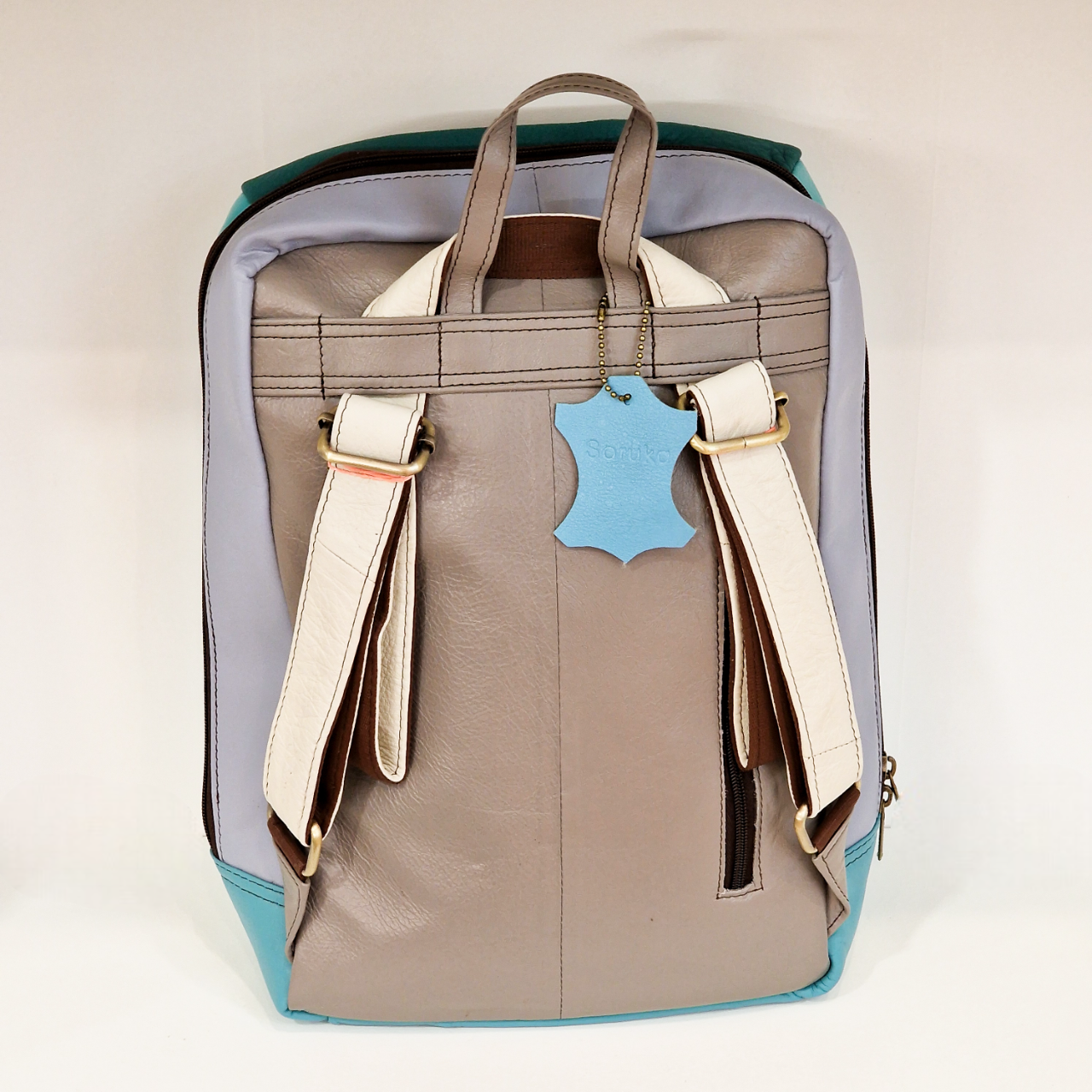 Mochila 100% couro reciclado, alça de mão e dupla alça de ombro ajustável e extensível.