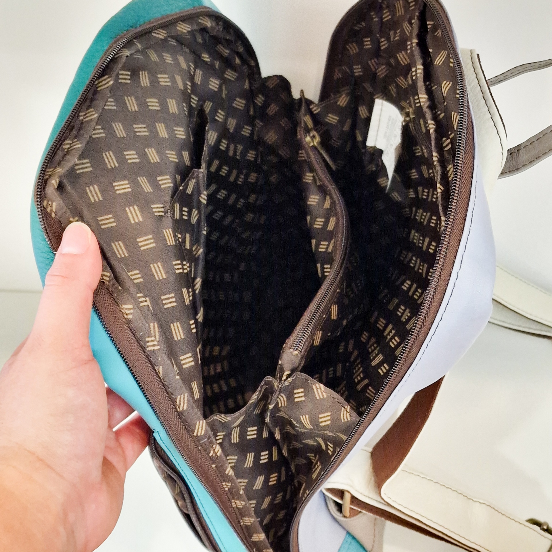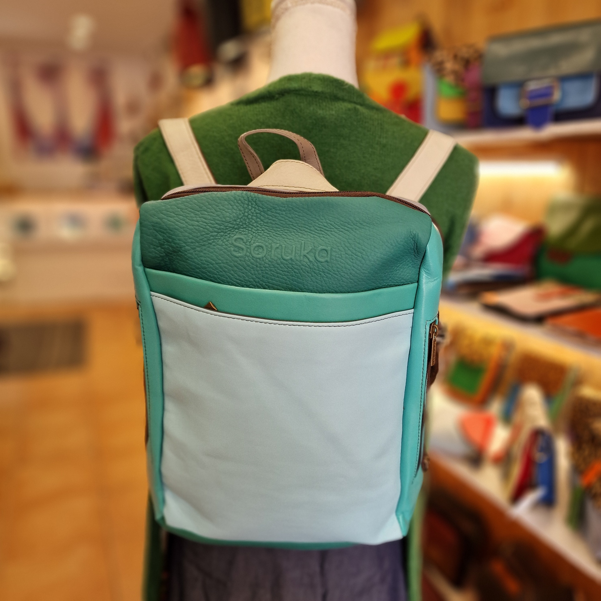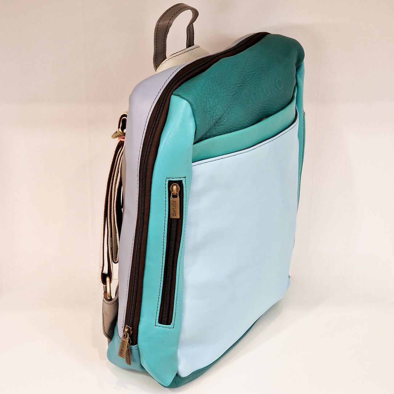 Mochila 100% couro reciclado, alça de mão e dupla alça de ombro ajustável e extensível.