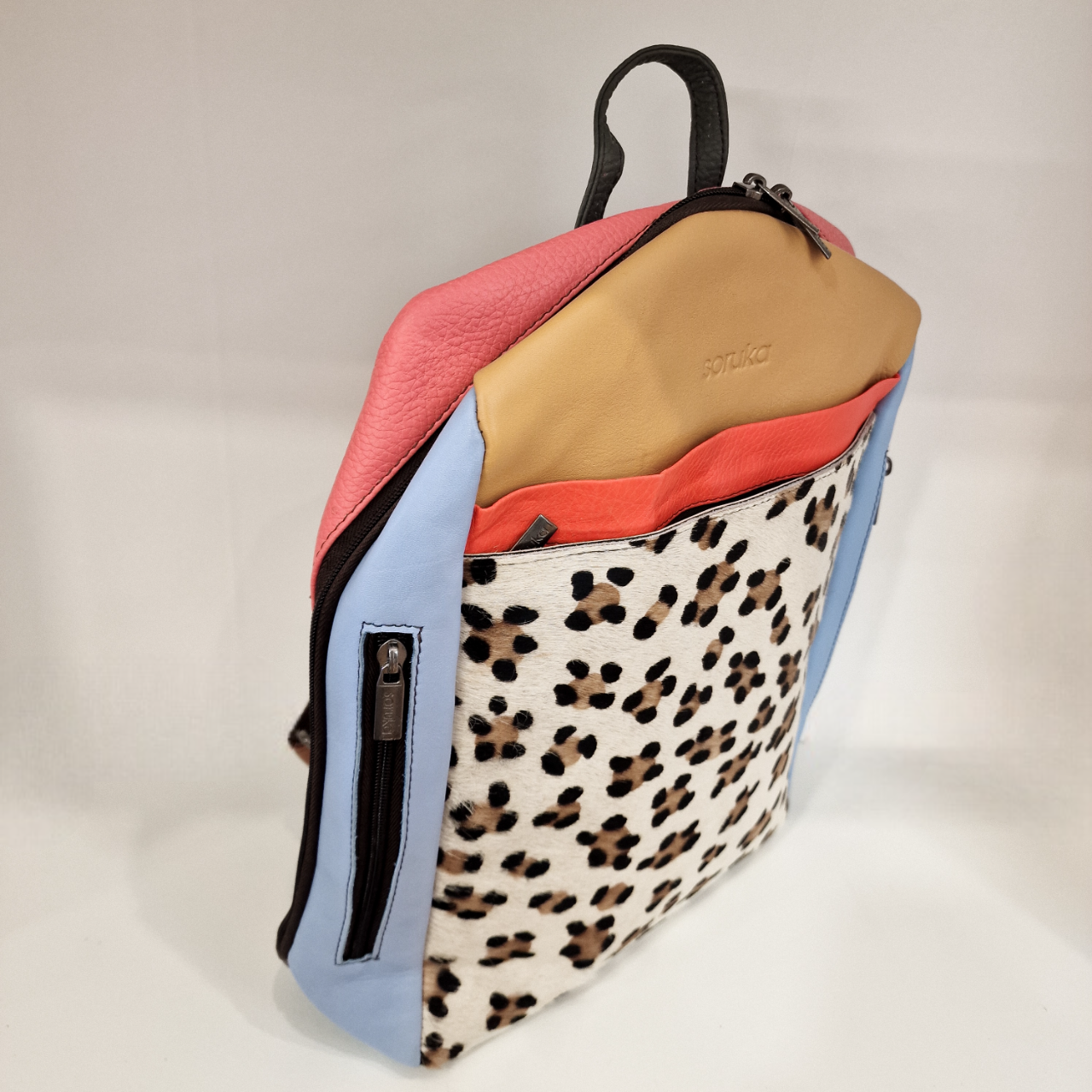 • Detalhe de mochila colorida com padrão animal print e fecho metálico